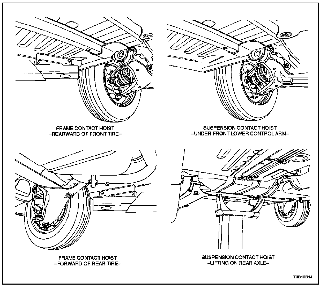 Many dealer service facilities and service stations are equipped with automotive hoists that bear upon some parts of the frame to lift the vehicle. If any other hoist method is used, use special care to avoid damaging the fuel thank, the filler neck, the exhaust system, or the underbody.