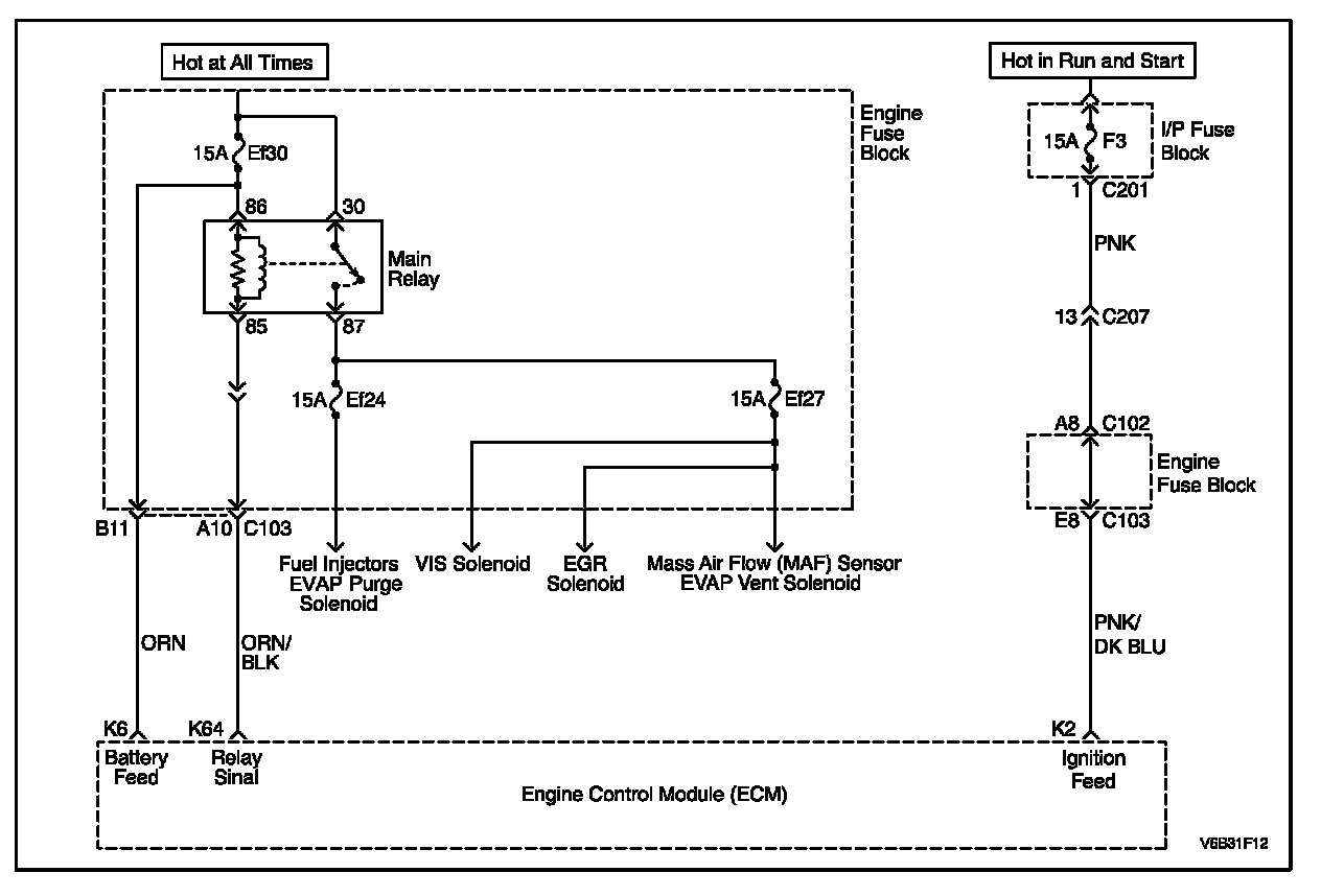 When the ignition is turned ON or to the START position, the main relay is energized. The main relay then supplies voltage to the engine fuse box fuse Ef24 and the engine fuse box fuse Ef27.