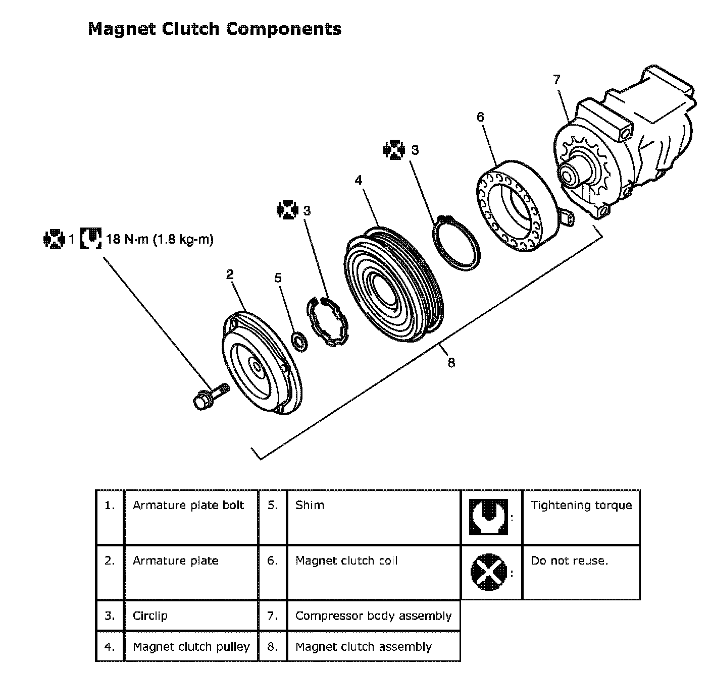 Never disassemble compressor body assembly. Disassembly will affect original performance of A/C system.