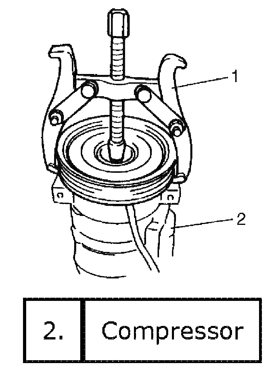 5. Adjust clearance between armature plate (1) and magnet clutch pulley (2) by putting shim(s) on compressor shaft.