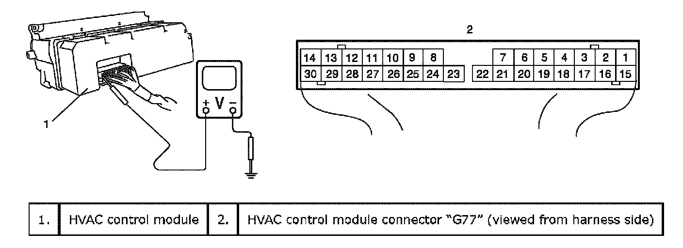 CAUTION: HVAC control module can not be checked by itself. It is strictly prohibited to connect voltmeter to HVAC control module with couplers disconnected from it.