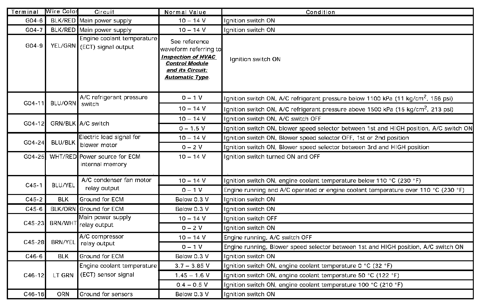 ECM Voltage Values Table for Relation of A/C Control