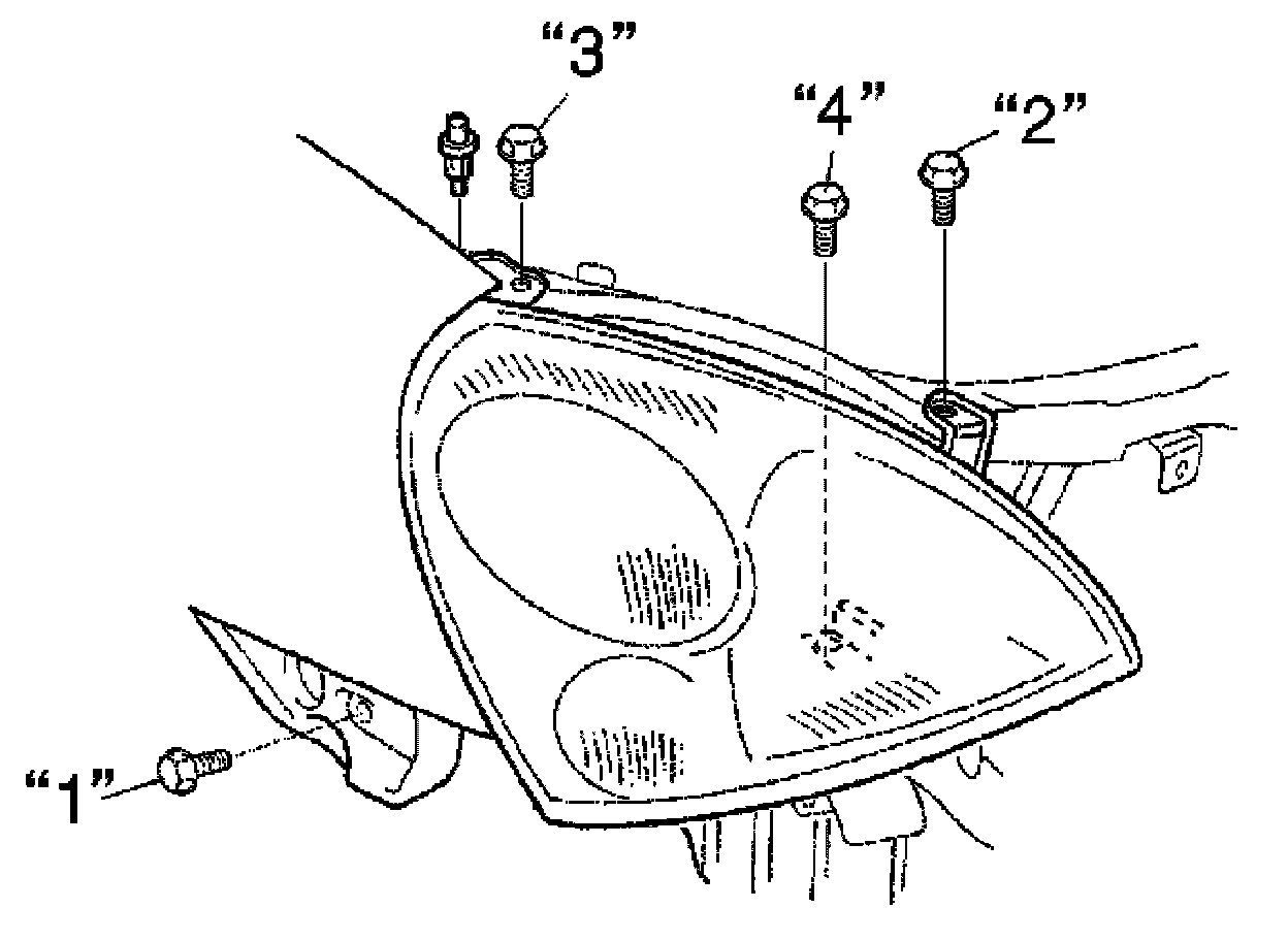 - Install headlight mounting bolts and clip, and then tighten headlight mounting bolts ("1"-"4") according to numerical order is as shown.