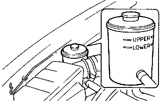 POWER STEERING FLUID LEVEL CHECKWith engine stopped, check fluid level indicated on oil tank, which should be between "UPPER" and "LOWER" marks.