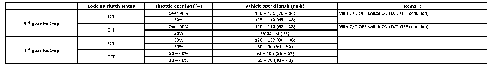 Automatic Gear Shift Table (for 2WD Model)Automatic gear shift schedule is shown in the following table. Test-drive the vehicle on a flat road in the D position.