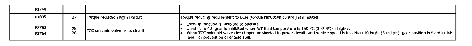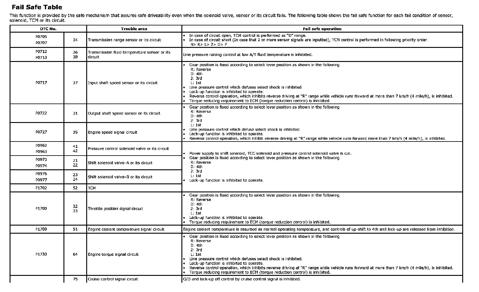 Fail Safe TableThis function is provided by the safe mechanism that assures safe driveability even when the solenoid valve, sensor or its circuit fails. The following table shows the fail safe function for each fail condition of sensor, solenoid, TCM or its circuit.