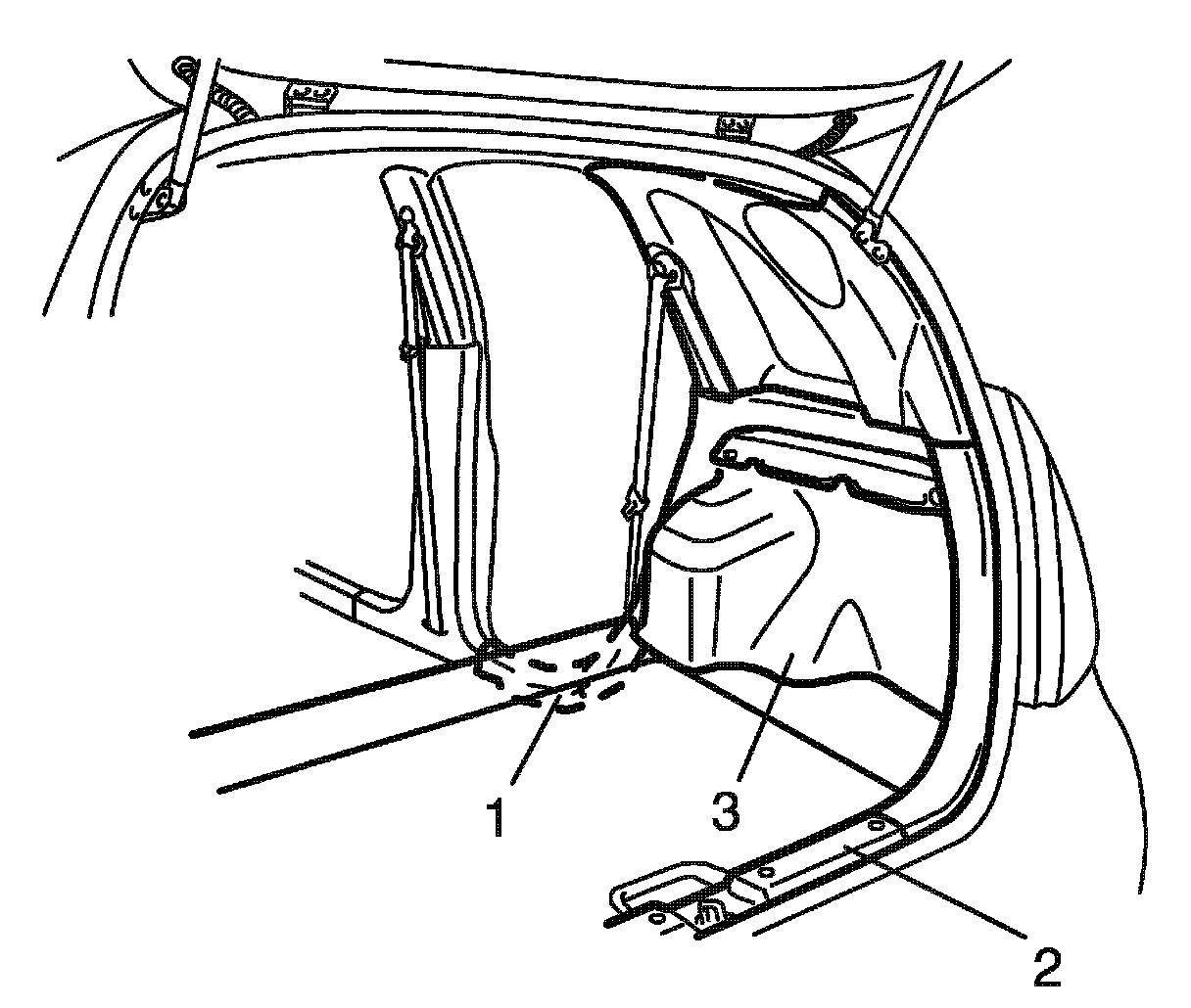 2. Remove rear side still scuff (1), rear luggage end garnish (2) and quarter inner trim (3).