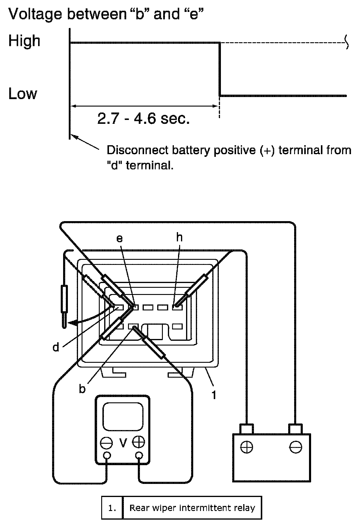 c. Check that voltage between "b" terminal and "e" terminal changes as in the figure when disconnecting battery positive (+) terminal from "d".