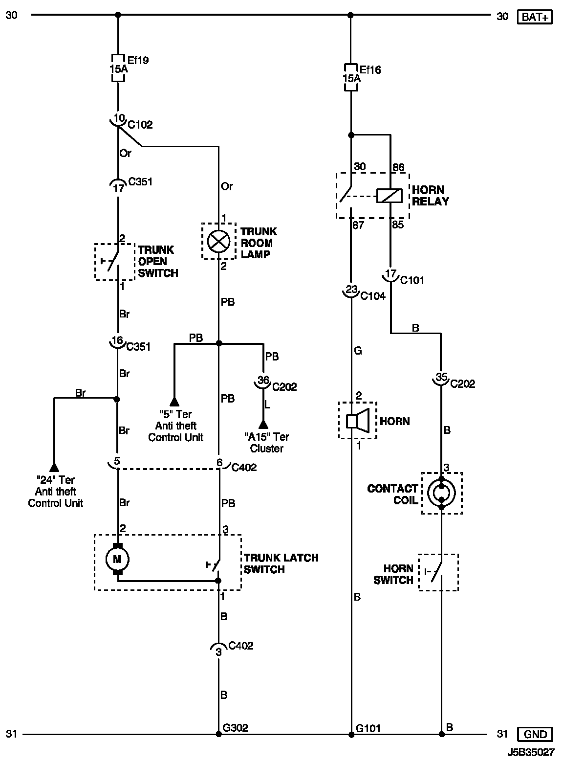 Trunk/Tailgate Open Switch, Trunk Latch Switch, Trunk Room Lamp and Horn Circuit Wiring Diagram (For NOTCHBACK Model):