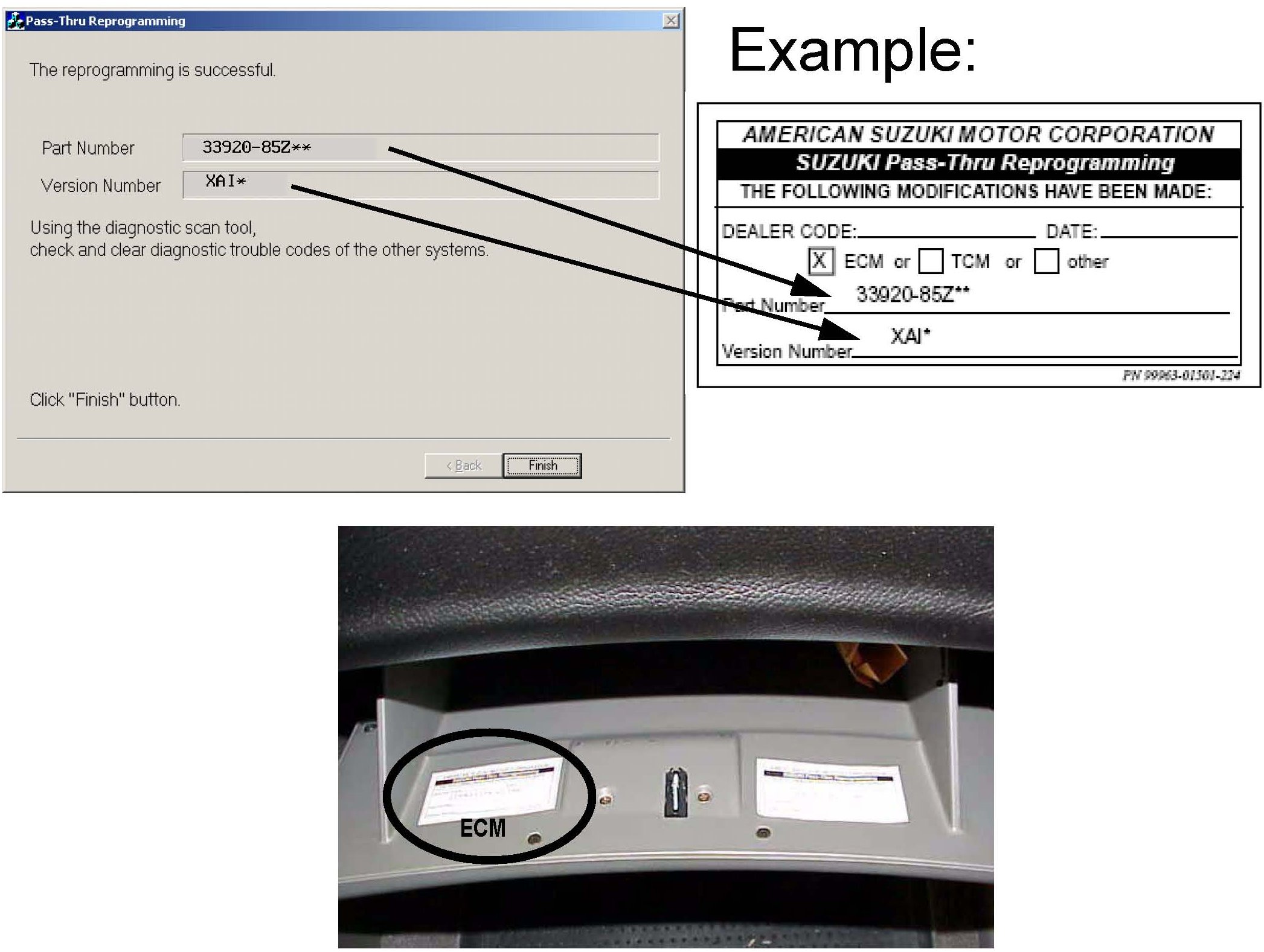 6. Fill out the Reprogram Label P/N 99963-01501-224 (the part number and version will be displayed at the "The reprogramming is successful" screen). Then affix the label to the back of the glove box door as pictured below.