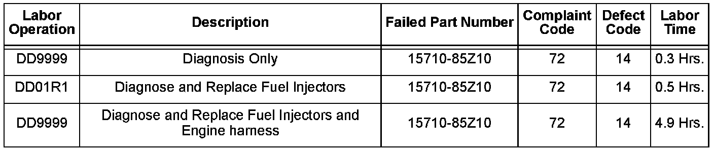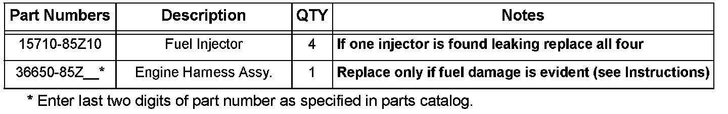 Replace four(4) fuel injectors if fuel leakage is detected in one injector and replace the affected wiring harness if needed. Refer to the service manual for replacement procedure.
