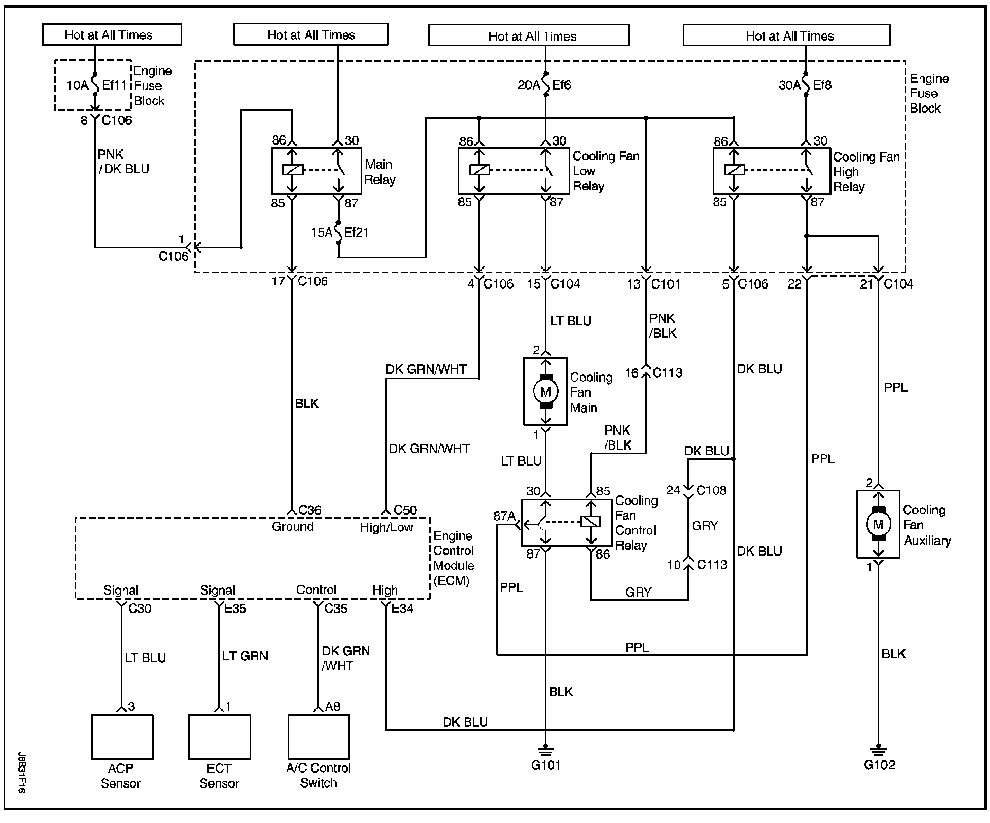 The engine cooling fan circuit operates the main cooling fan and the auxiliary cooling fan. The cooling fans are controlled by the Engine Control Module (ECM) based on inputs from the Engine Coolant Temperature (ECT) sensor and the Air Conditioning Pressure (ACP) sensor. The ECM controls the low speed cooling fan operation by internally grounding the ECM connector terminal C50. This energizes the low speed cooling fan relay and operates the main cooling fan and the auxiliary cooling fan at low speed as the cooling fans are connected in a series circuit. The ECM controls the high speed cooling fan operation by internally grounding the ECM connector terminal C50 and the ECM connector terminal E34 at the same time. This energizes the low speed cooling fan relay, the high speed cooling fan relay, and the series/parallel cooling fan relay resulting in high speed fan operation as the cooling fans are now connected in a parallel circuit.