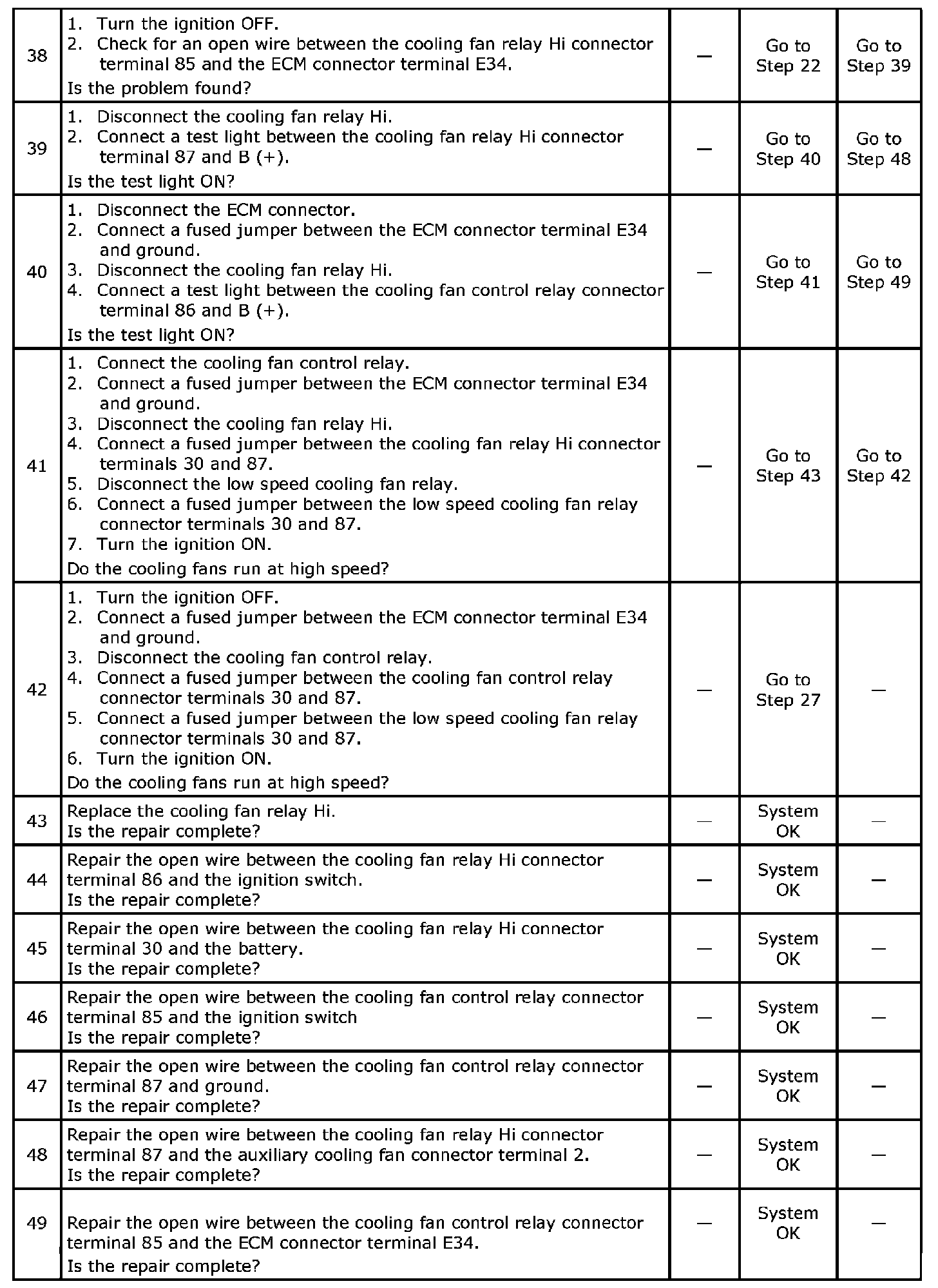 ^ The cooling fan circuit can be checked quickly by disconnecting the ECM connector 2 and grounding the connector terminal C50. This should create low speed cooling fan operation with the ignition ON. By grounding the ECM connector terminals C50 and E34 and turning the ignition ON, high speed cooling fan operation should be achieved.