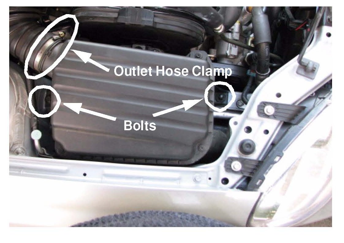 4. Remove the air cleaner assembly by removing the two bolts and loosening the outlet hose clamp indicated in the illustration. Slip the outlet hose off of the air cleaner then lift the air cleaner out of the engine compartment.