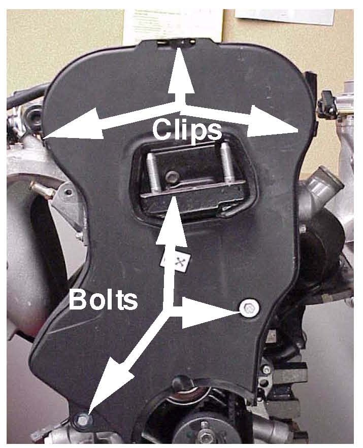 9. Referring to the illustration, remove the timing belt cover by releasing the three clips at the top of the cover. Next remove the three bolts indicated. Tip the cover toward the fender to clear the engine mount bracket, and slide the cover up and out.