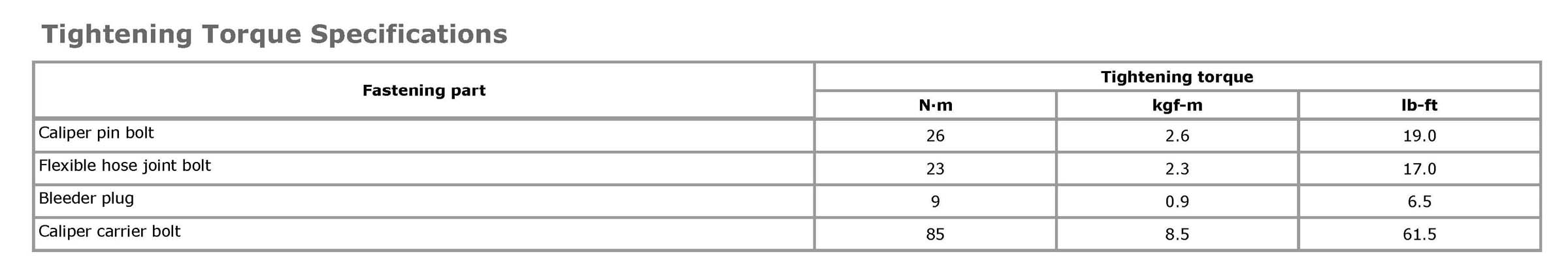 Tightening Torque SpecificationsNOTE: The specified tightening torque is also described in the following. Front Disc Brake Components