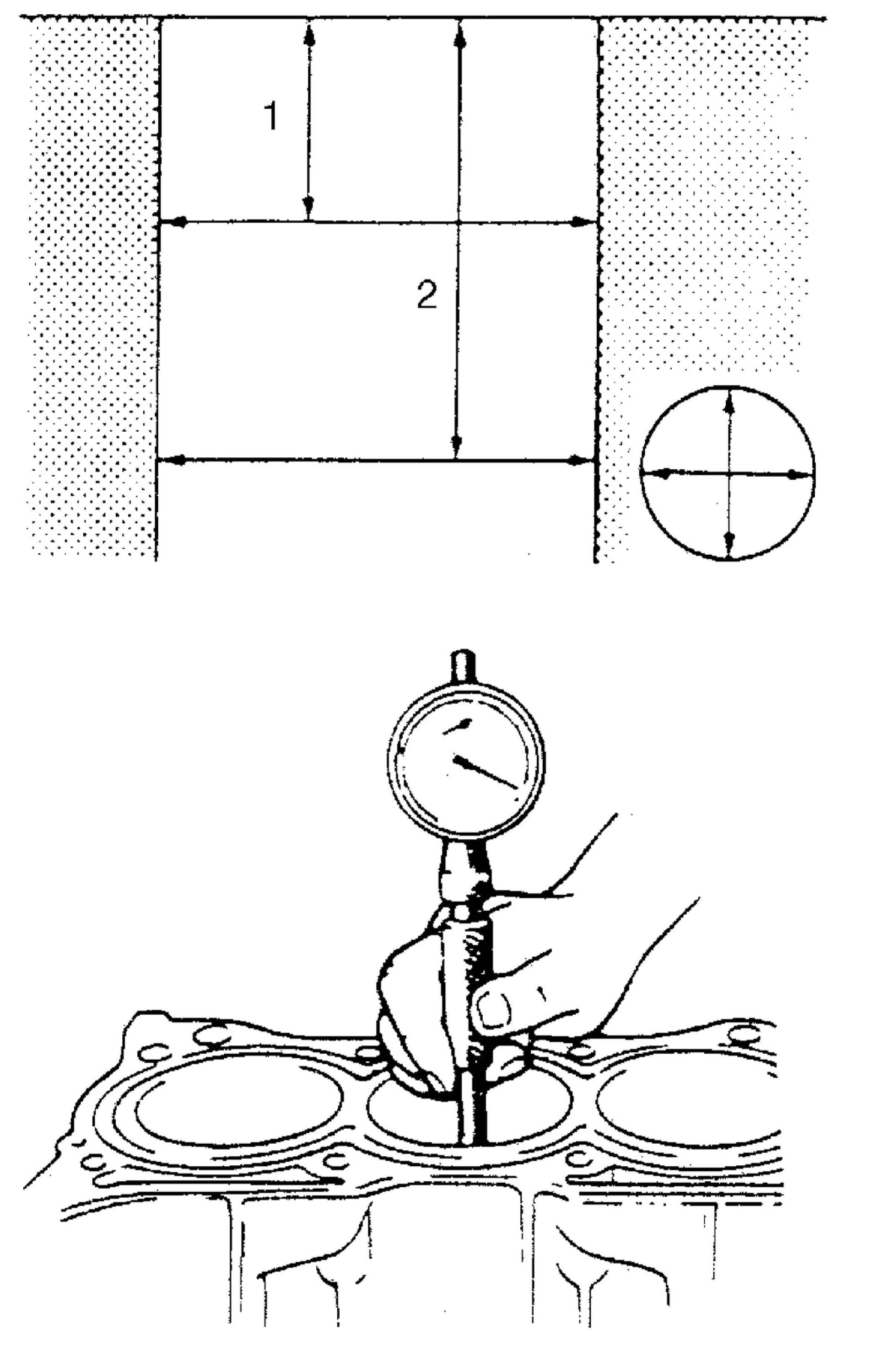 ^ Using a cylinder gauge, measure cylinder bore in thrust and axial directions at two positions as shown in figure.