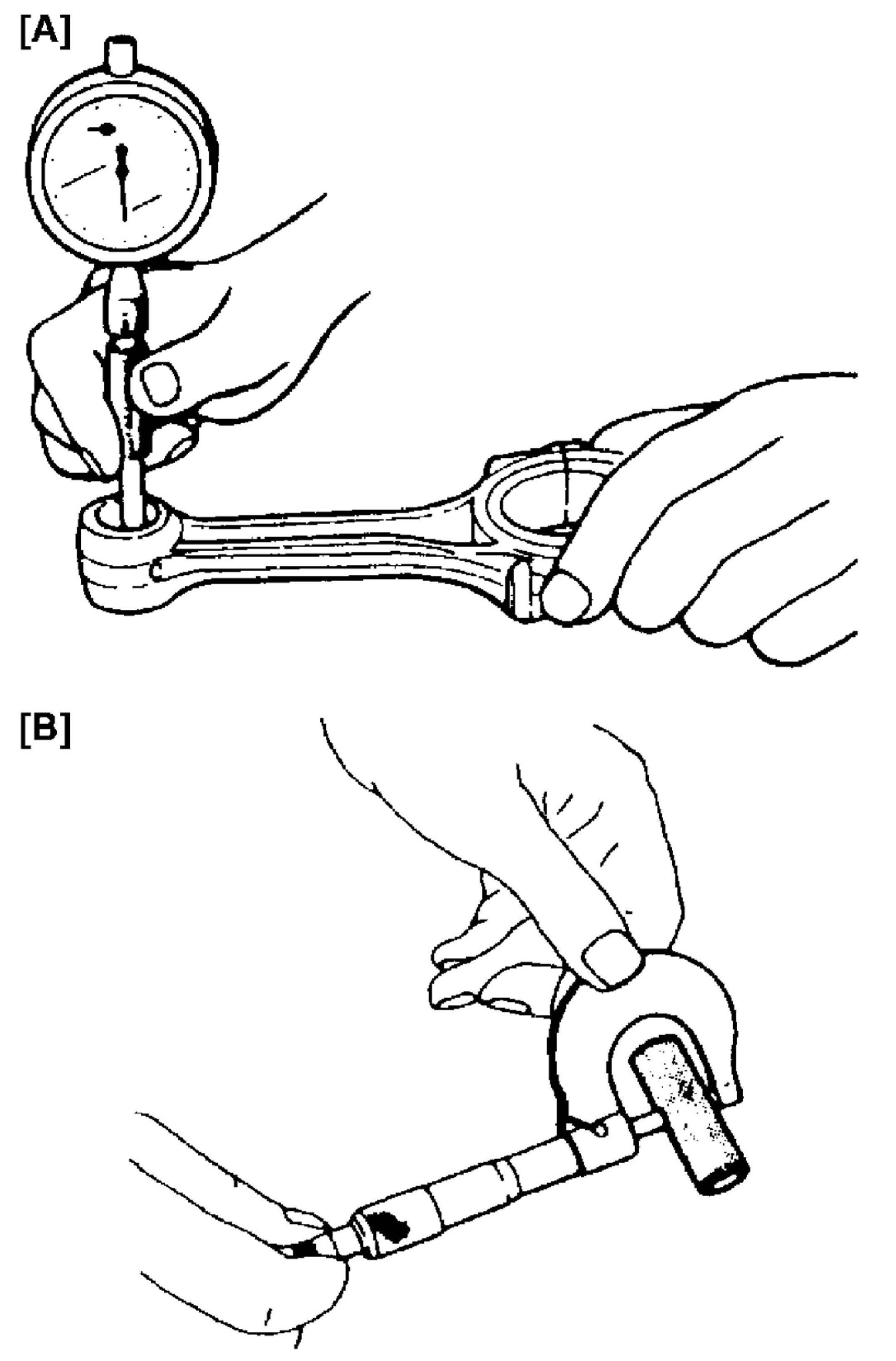 ^ Piston pin clearance: Check piston pin clearance in small end. Replace connecting rod if its small end is badly worn or damaged or if measured clearance exceeds limit.