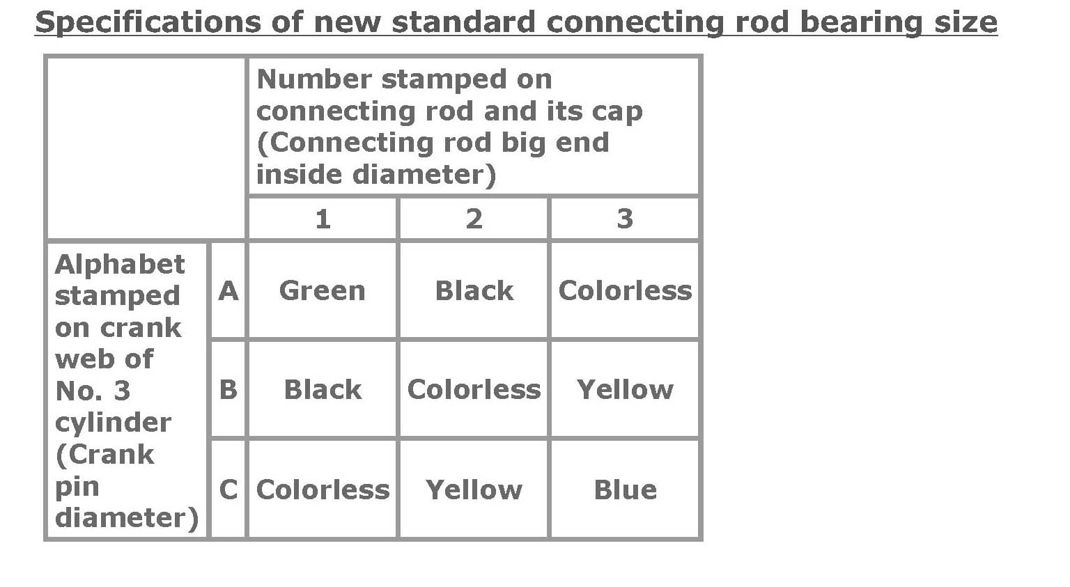 For example, if number stamped on connecting rod and its cap is "1" and alphabet stamped on crank web No. 3 cylinder is "B", install a new standard bearing painted in "Black" to its connecting rod big-end inside.