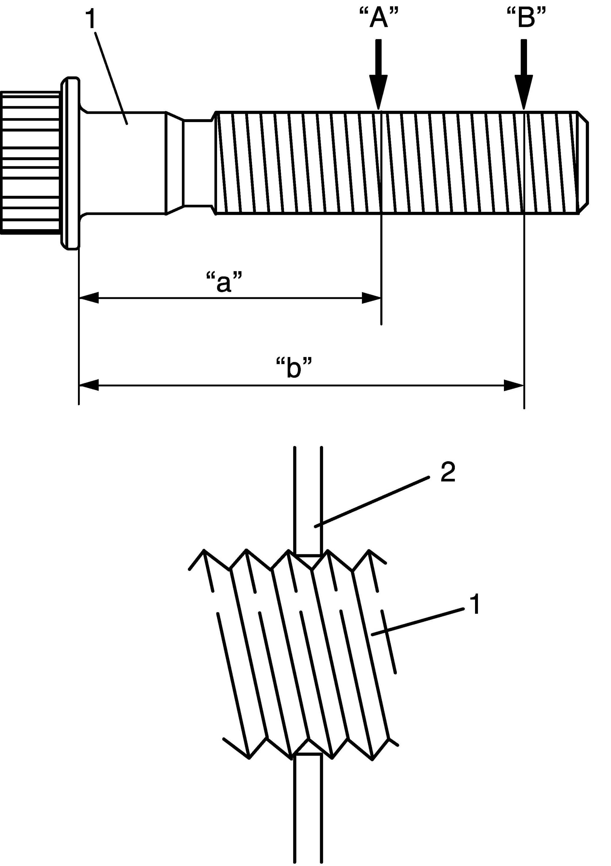 Measure each thread diameter of connecting rod bolts (1) at "A" on 28.5 mm (1.12 in.) from bolt mounting surface and "B" on 42.0 mm (1.65 in.) from bolt mounting surface by using a micrometer (2). Calculate difference in diameters ("A"-"B"). If it exceeds limit, replace connecting rod.