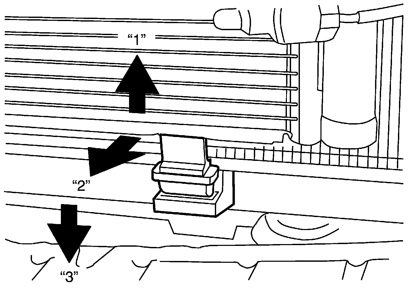 5. Move condenser assembly from the vehicle in the arrow direction in the order of 1, 2 and 3 as shown, and it can be removed.