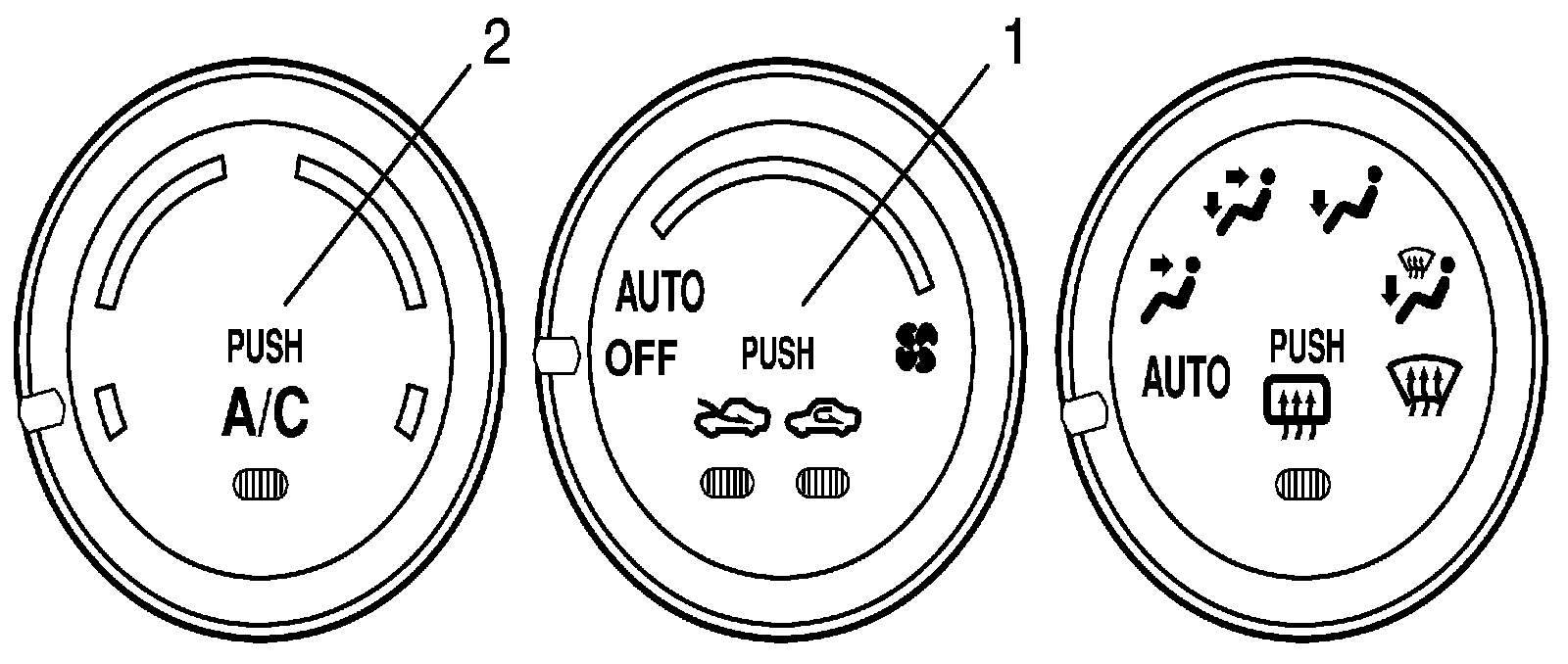2. Press air intake selector (1) and "A/C" switch (2) at the same time for 5 seconds or more.