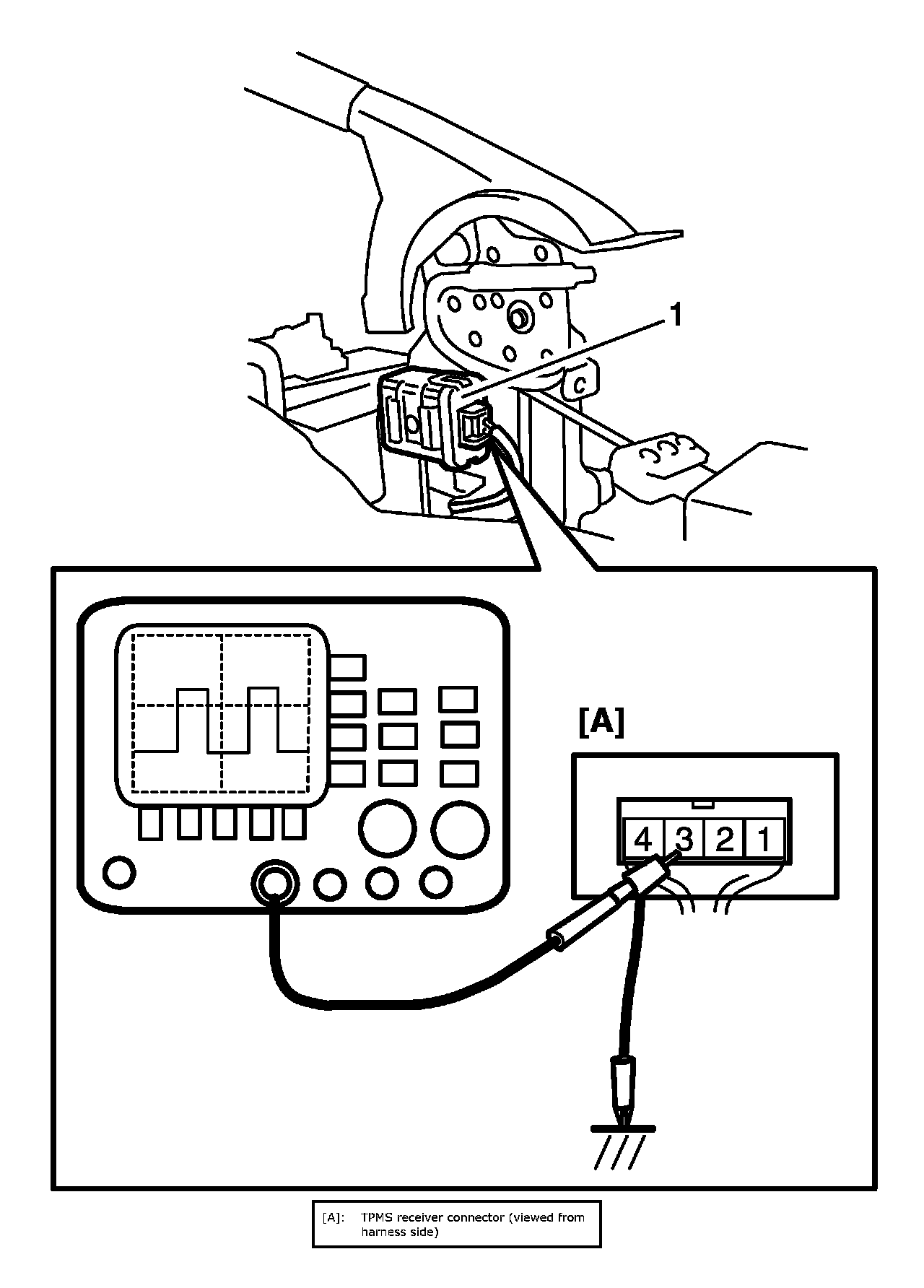 2. Connect oscilloscope to 3 terminal of TPMS receiver (1).