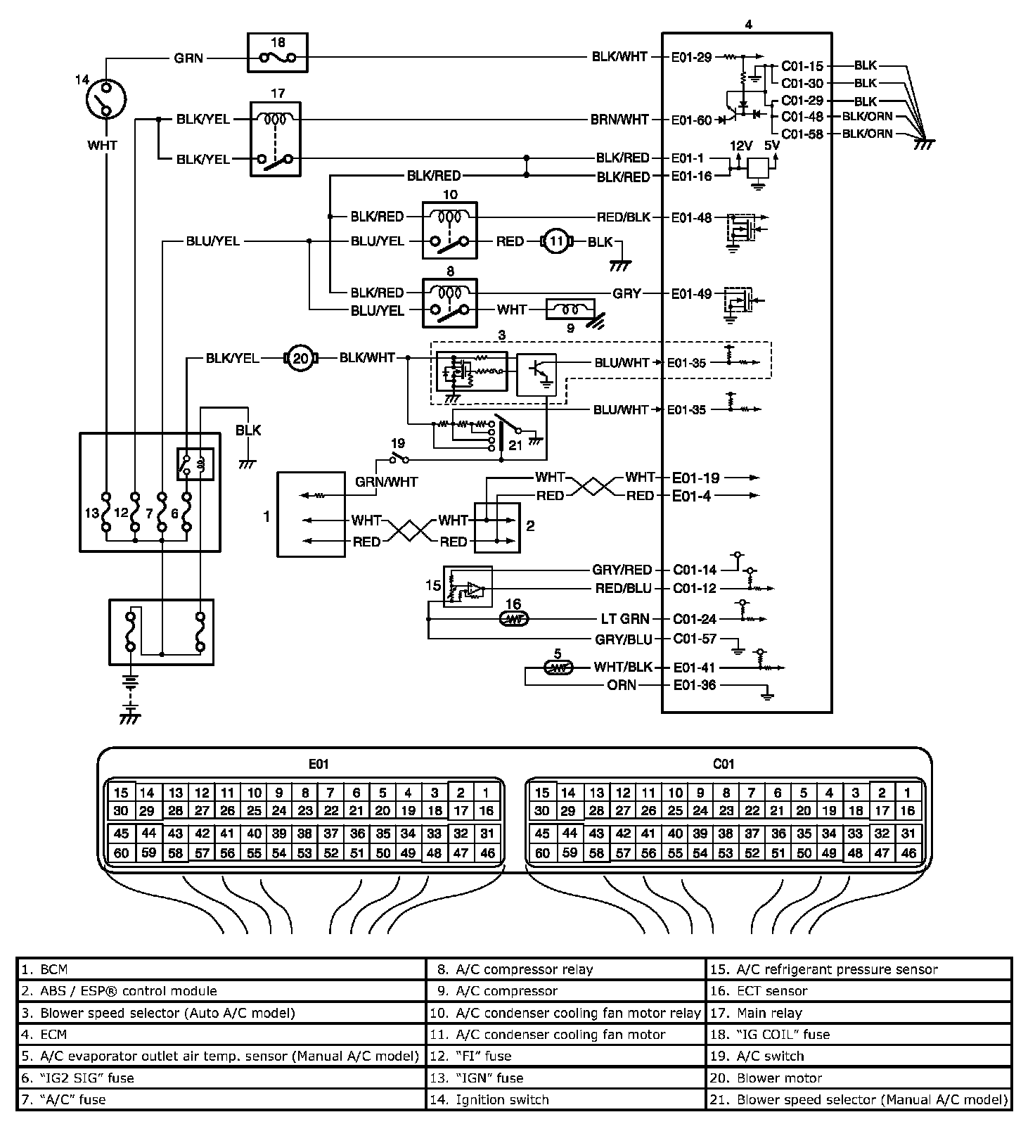 ^ When A/C evaporator outlet air temp. is below 2 °C (35.6 °F), A/C remains OFF ("E01-49" terminal voltage becomes 10 - 14 V). This condition is not abnormal.
