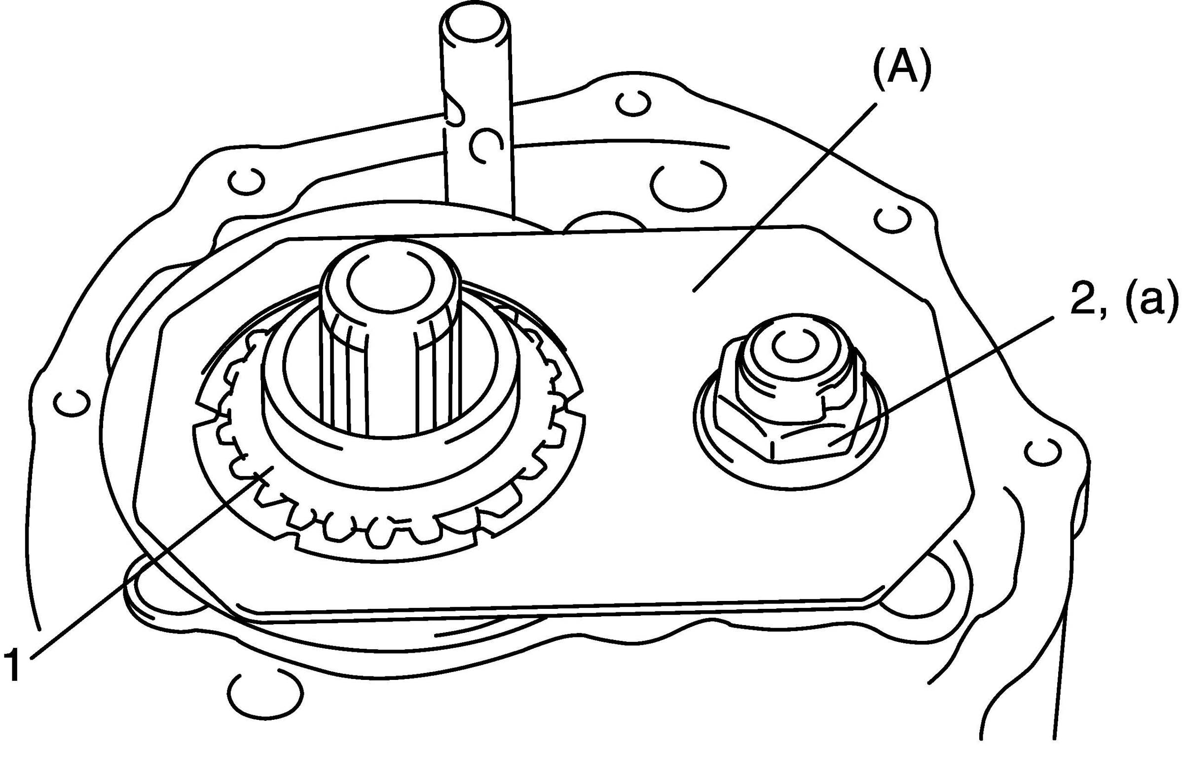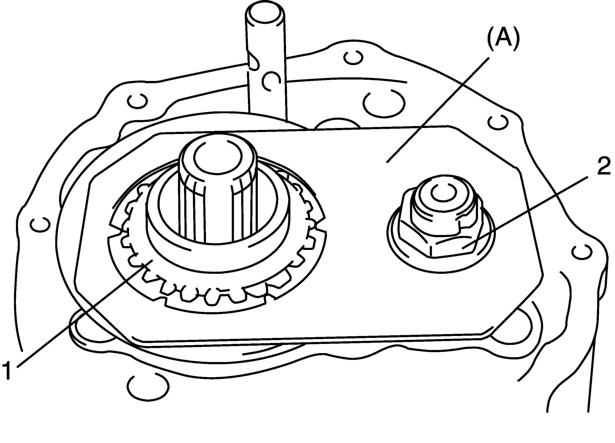 8. Tighten shift fork shaft bolt (2) to which thread lock cement has been applied.