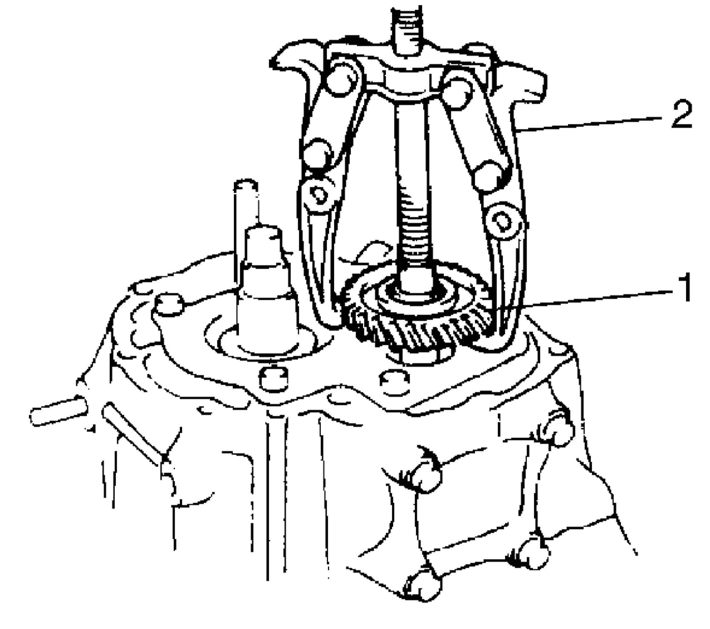 6. Remove input shaft 5th gear, needle bearing and then countershaft 5th gear (1). Gear puller (2) would be necessary if spline fitting of countershaft 5th gear is tight.
