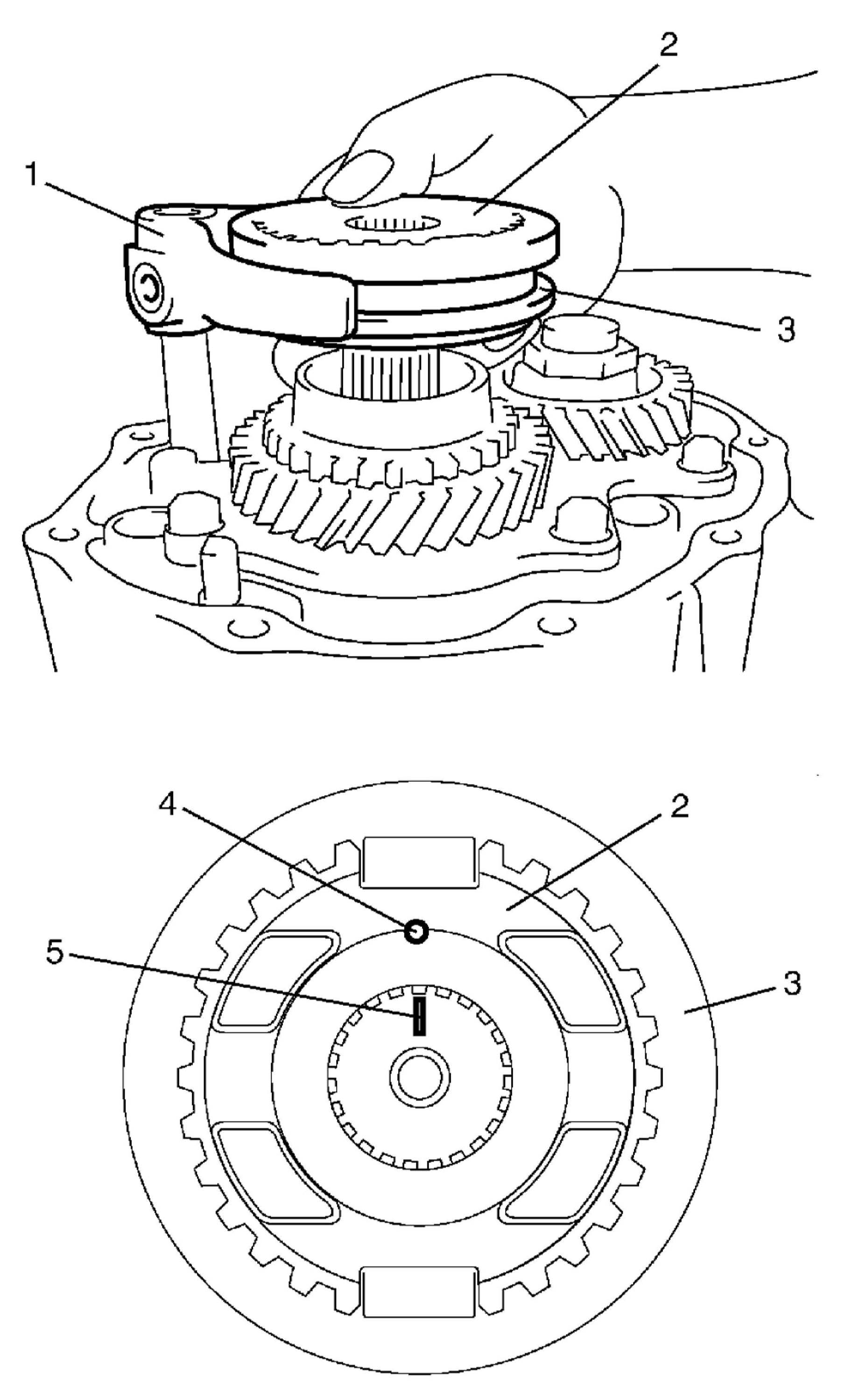 7. Fit 5th gear shift fork (1) to sleeve (3) and hub (2) assembly, and install them into input shaft and gear shift shaft, aligning punch mark (4) with matching mark (5) on input shaft.