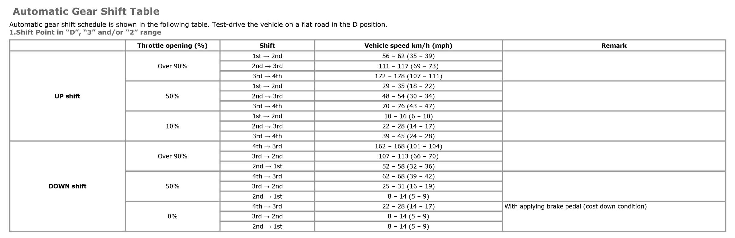 Automatic Gear Shift TableAutomatic gear shift schedule is shown in the following table. Test-drive the vehicle on a flat road in the D position.