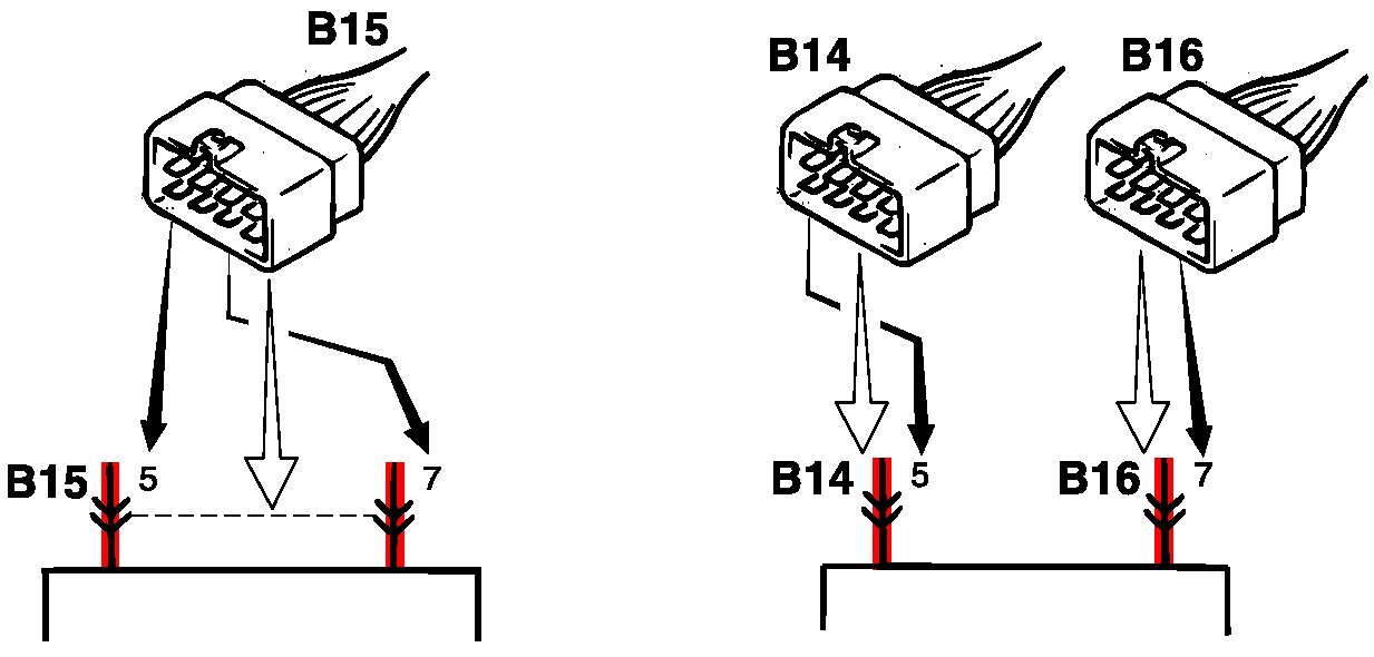 3. Terminals in one connector (Broken line) (B15)/Terminals in different connectors (B14, B16).