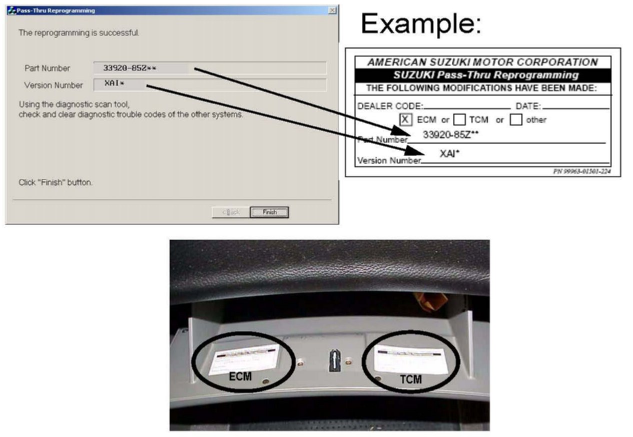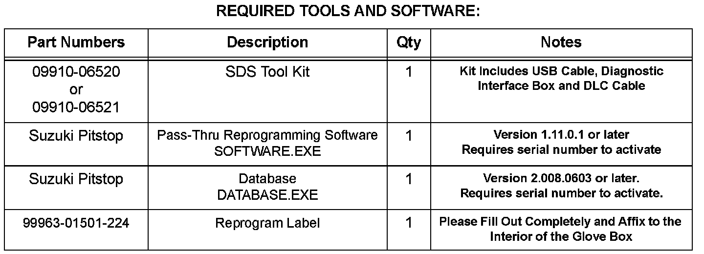 5. Following the procedures outlined in the Suzuki ECU Programming System Operator's Manual, hook up the SDS Interface Tool P/N 09910-06520 or 09910-06521 to the vehicle and run the ECM reprogramming software. If the message "[4028] ECU already has the latest version" appears, click "OK" and continue to step 6. The glove box label should already be in the glove box.