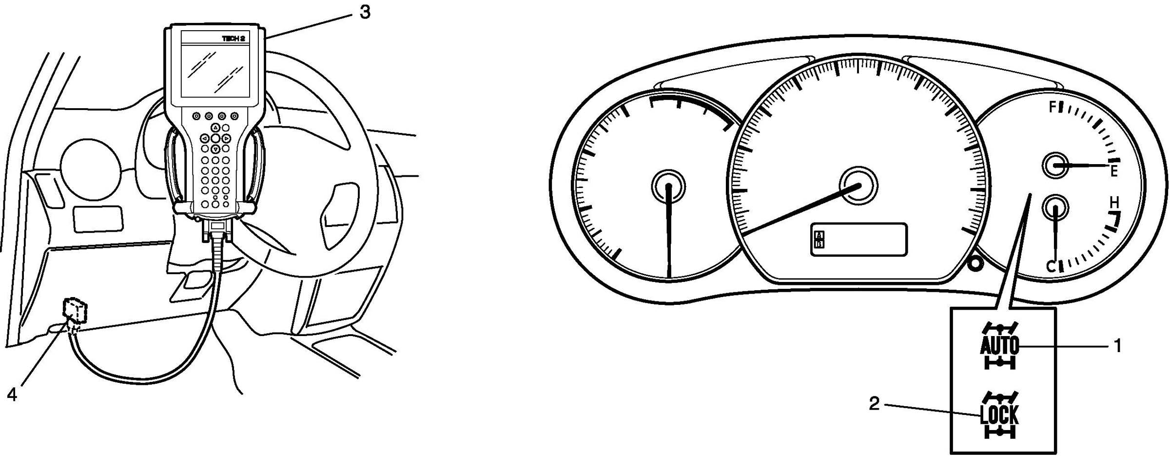 ^ When 4WD control module detects any malfunction in the following area, 4WD AUTO indicator (1) and 4WD LOCK indicator (2) flash continuously or turn on and 4WD control module comes into fail-safe mode.