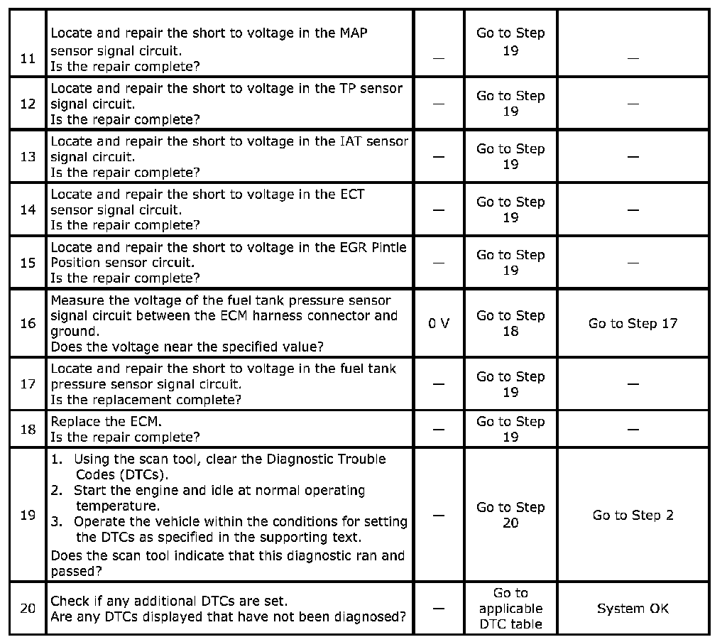 3. If a sensor input circuit has been shorted to voltage, ensure that the sensor has not been damaged. A damaged IAT or ECT sensor will continue to indicate a high voltage or low temperature after the affected circuit has been repaired. A damaged ACT, TP, MAP, Fuel Tank Pressure, or EGR Pintle Position sensor will indicate a high or low voltage or may be stuck at a fixed value after the affected circuit has been repaired. If the sensor has been damaged, replace it.