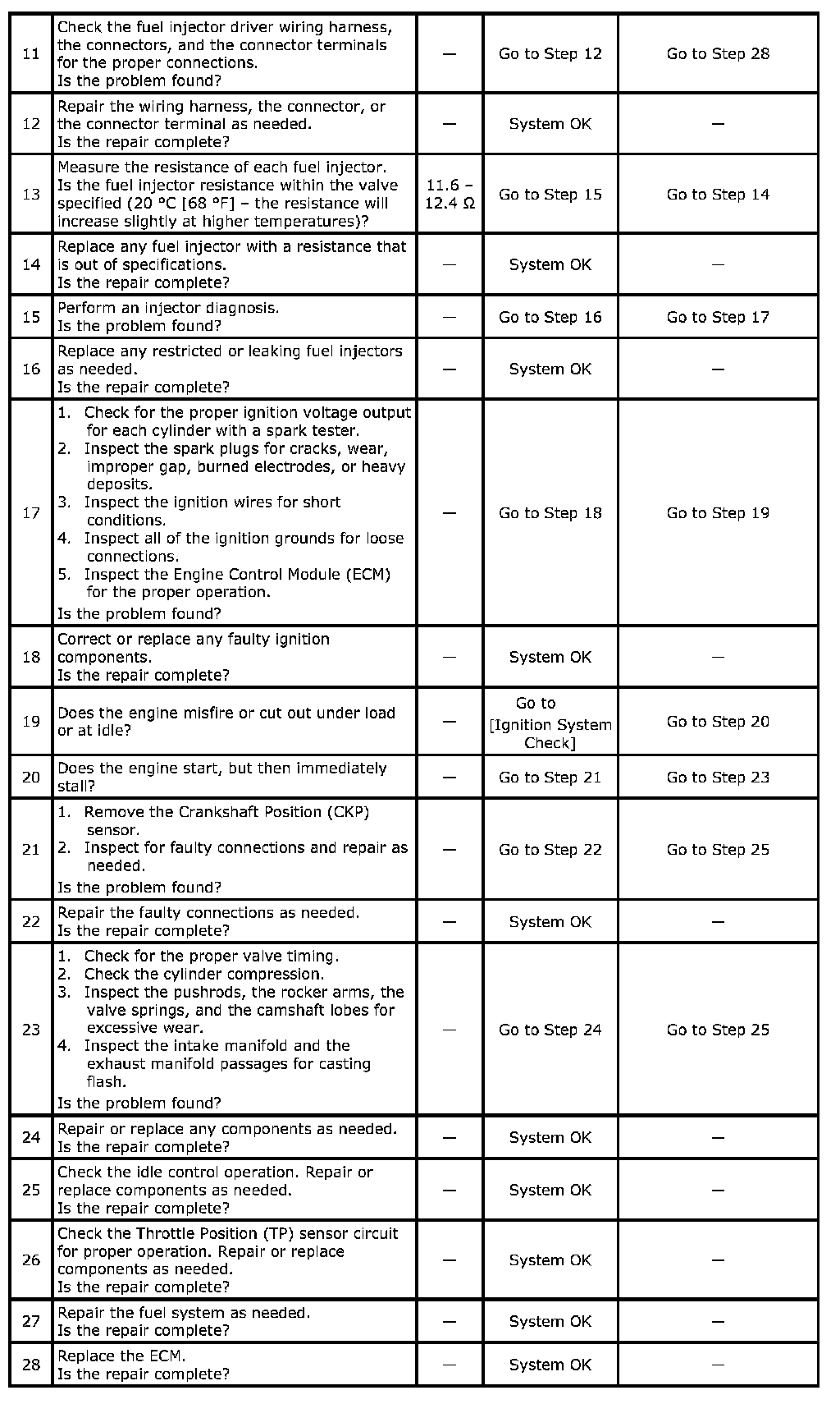 The engine cranks OK, but does not start for a long time. The engine eventually runs or may start and immediately die.