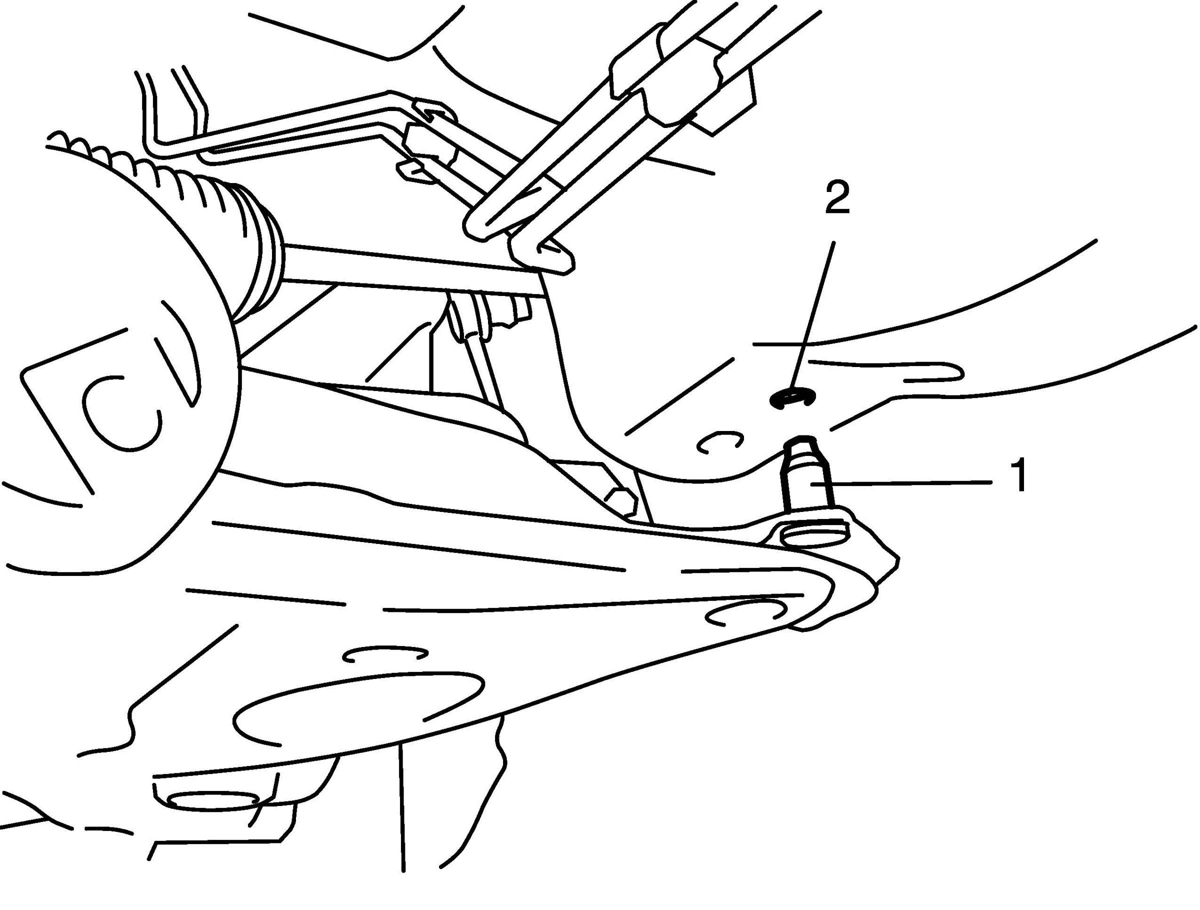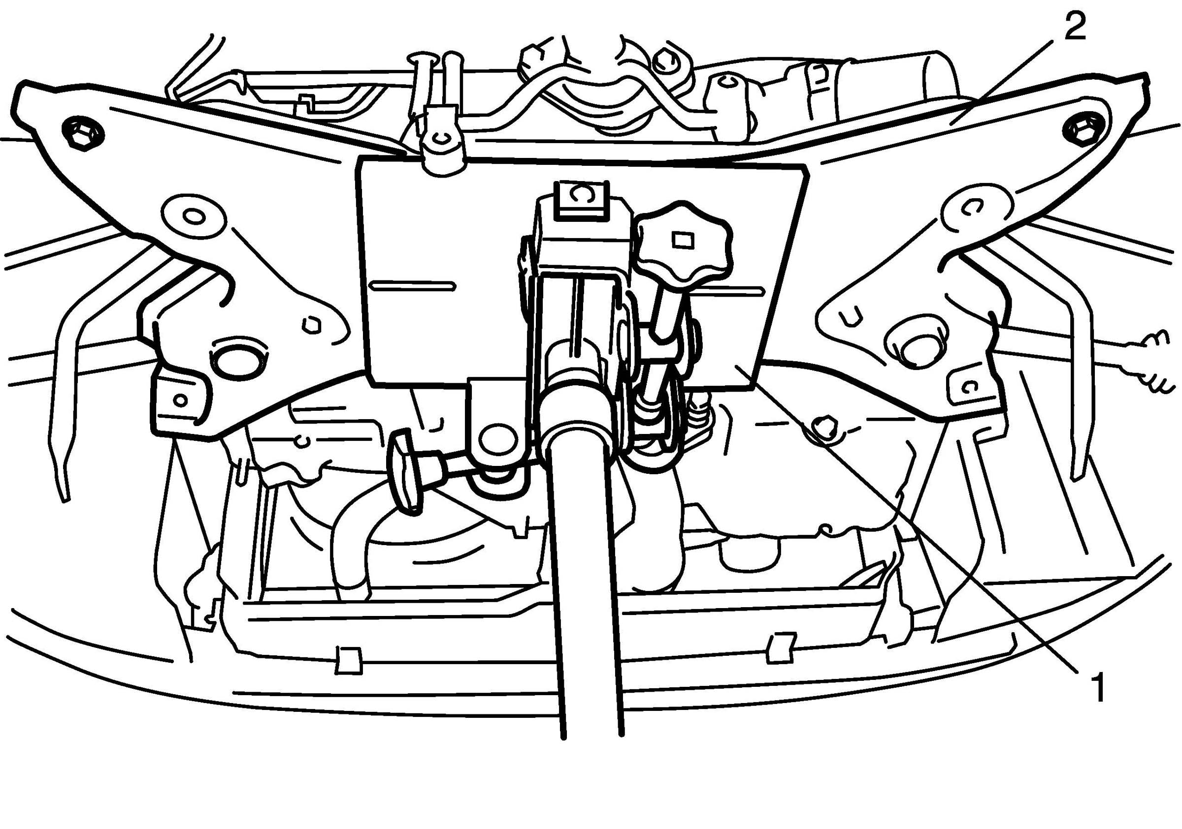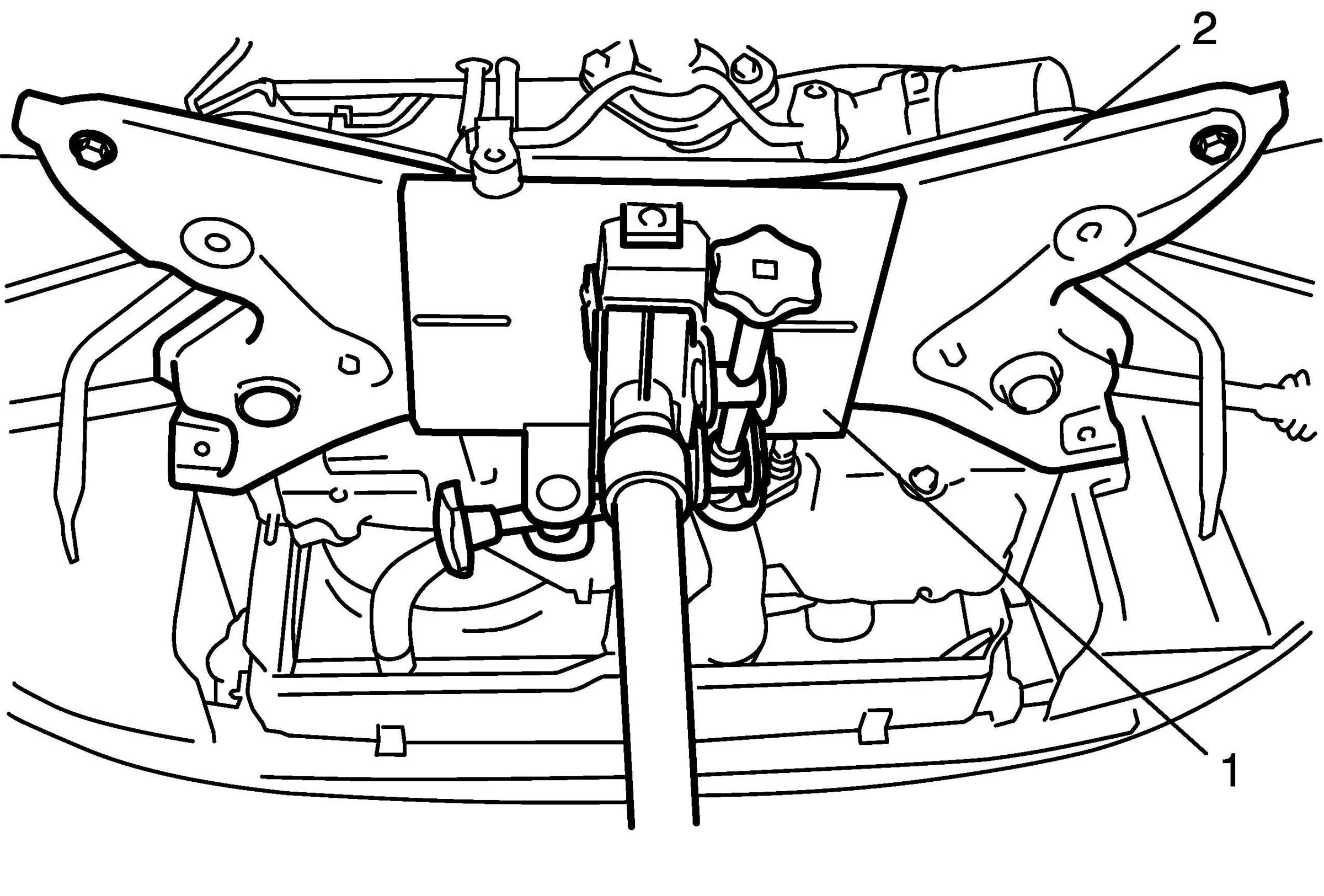 5. Align lugs (1) (right and left) of front suspension frame with whole (2) in vehicle body.