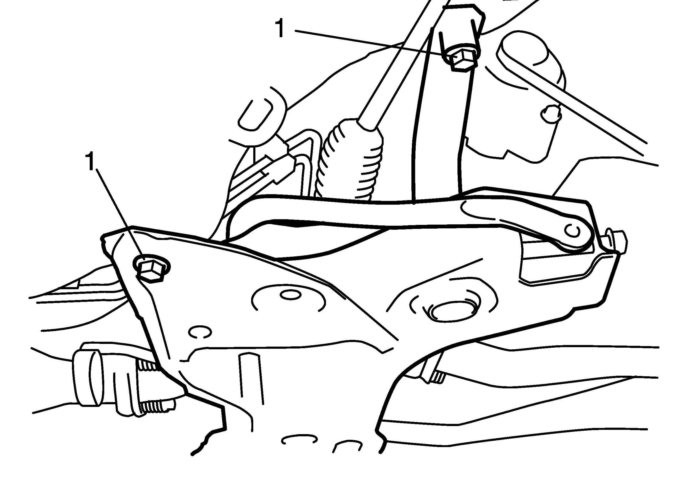 14. Remove engine rear mounting, mounting member bolt and front suspension frame mounting bolts (1).