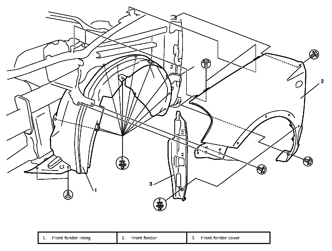 1. Remove side sill splash guard and front fender splash guard (if equipped) referring to Splash Guard Removal and Installation (If Equipped).