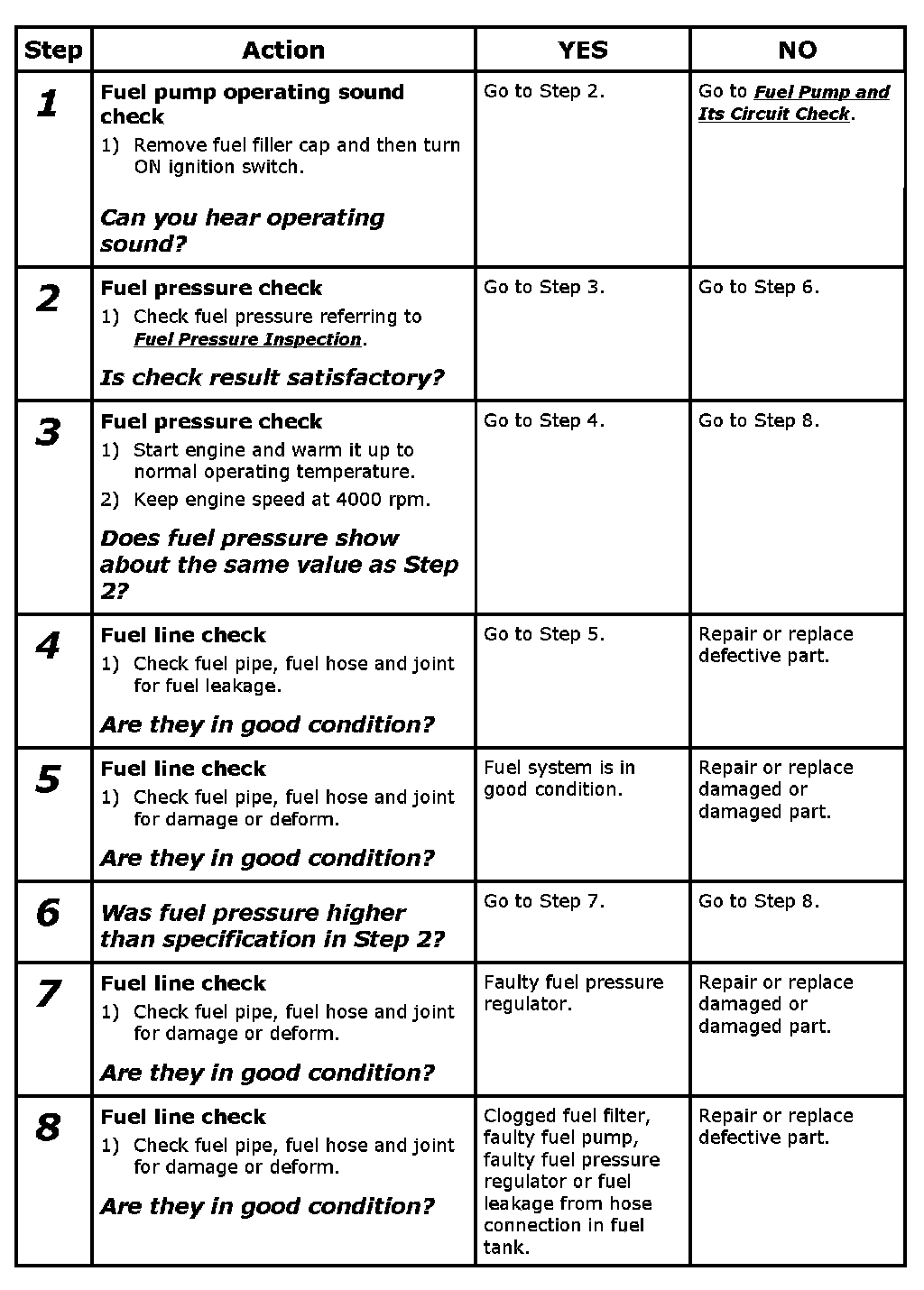 NOTE: Before using the following flow chart, chart check to make sure that battery voltage is higher than 11 V. If battery voltage is low, pressure becomes lower than specification even if fuel pump and line are in good condition.