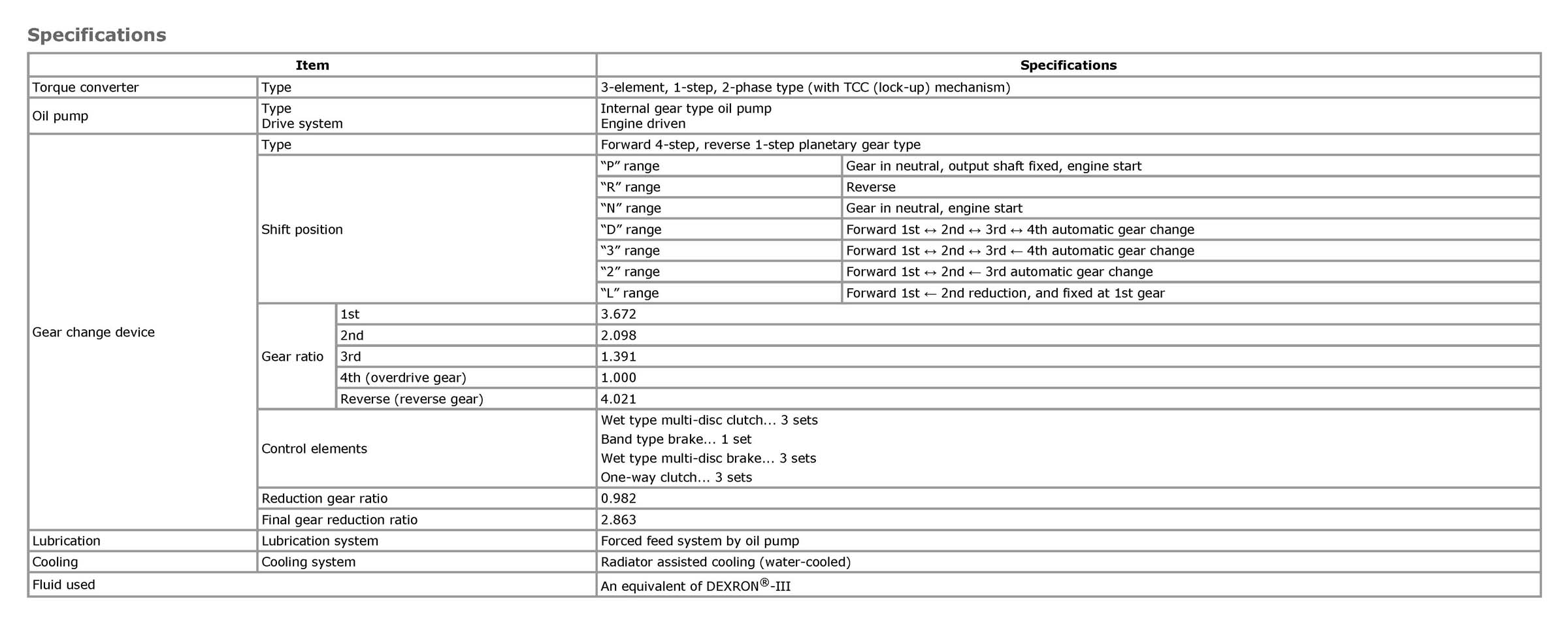 Automatic Transmission/Transaxle: Specifications
