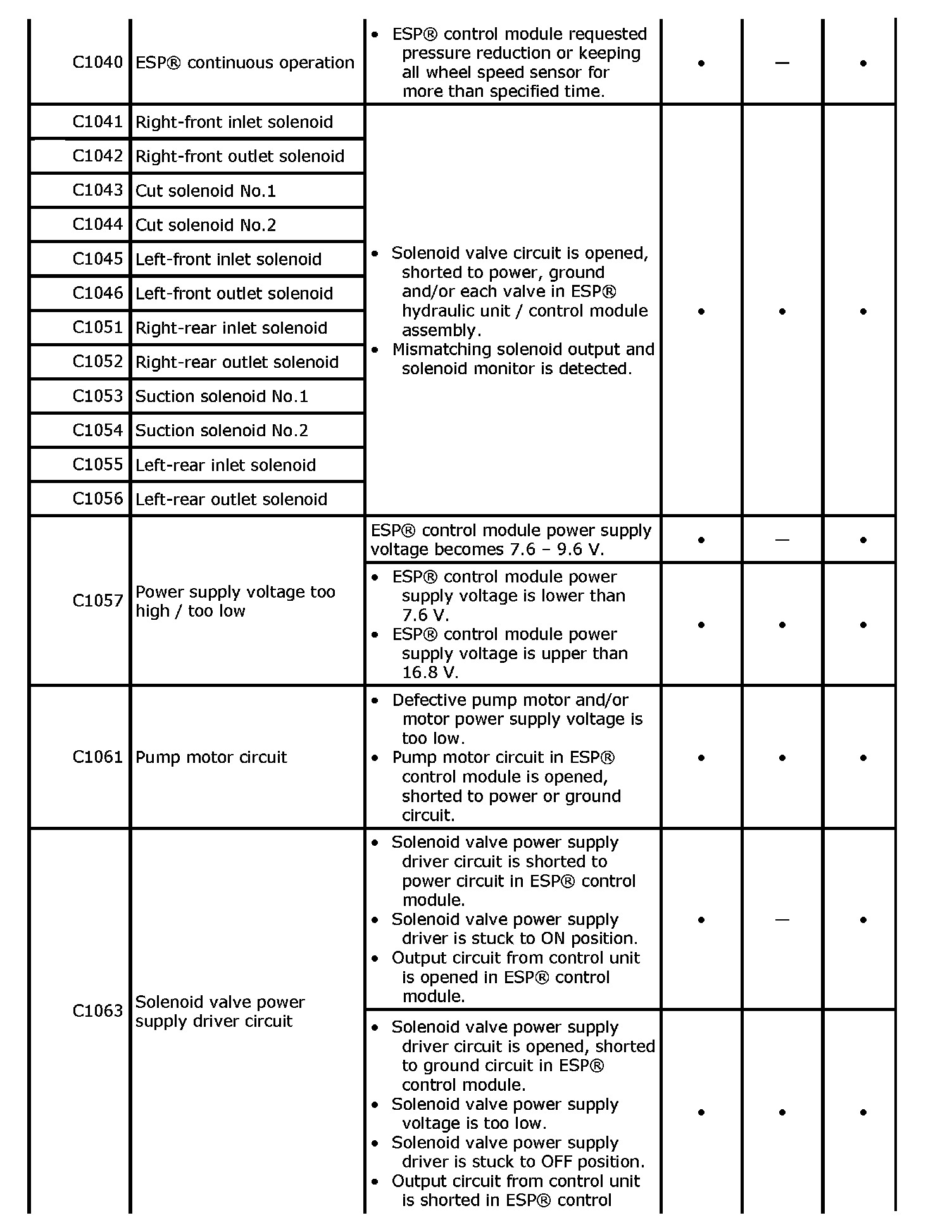 DTC TableCAUTION: Be sure to perform Electronic Stability Program Check before starting diagnosis.