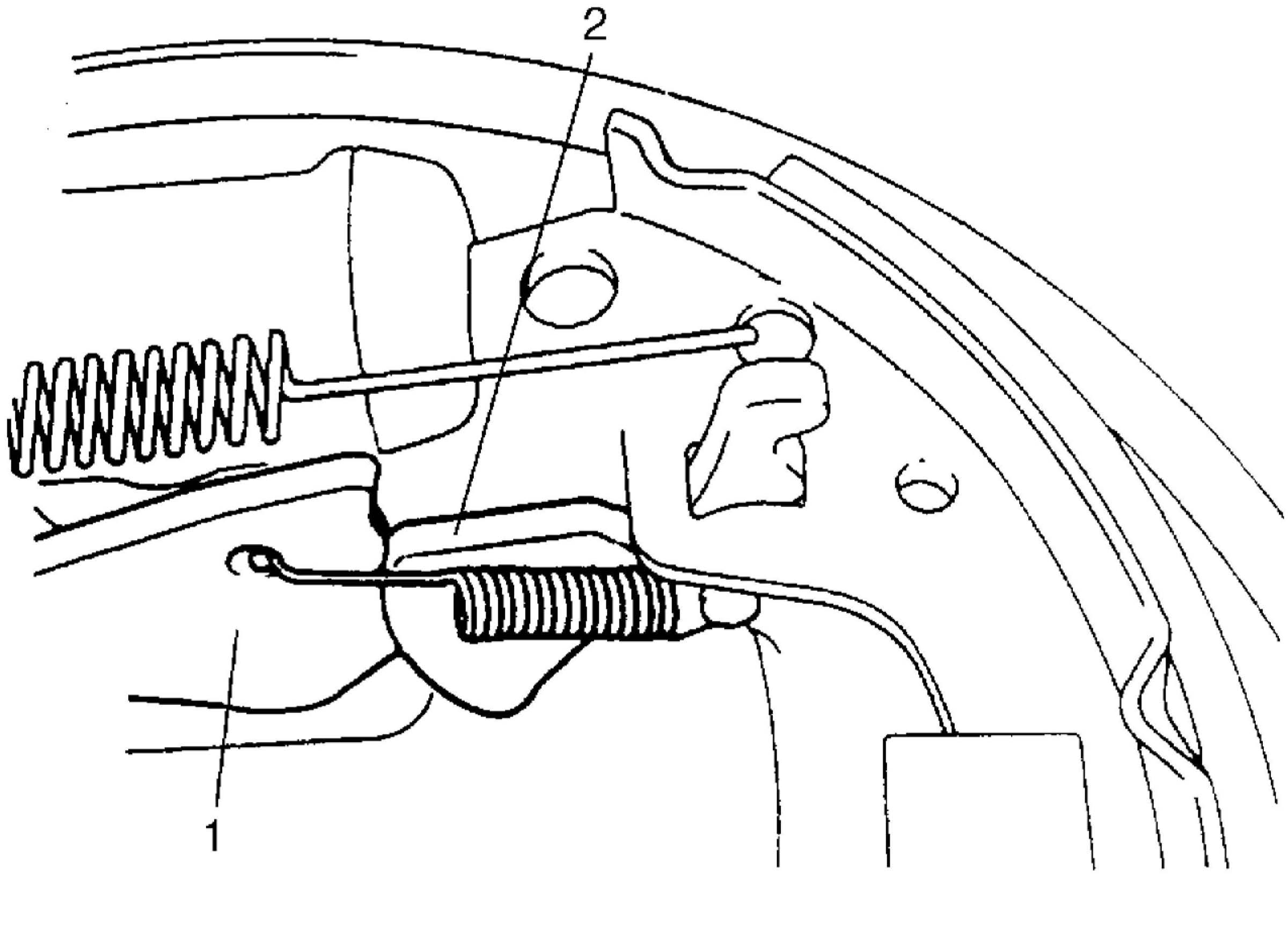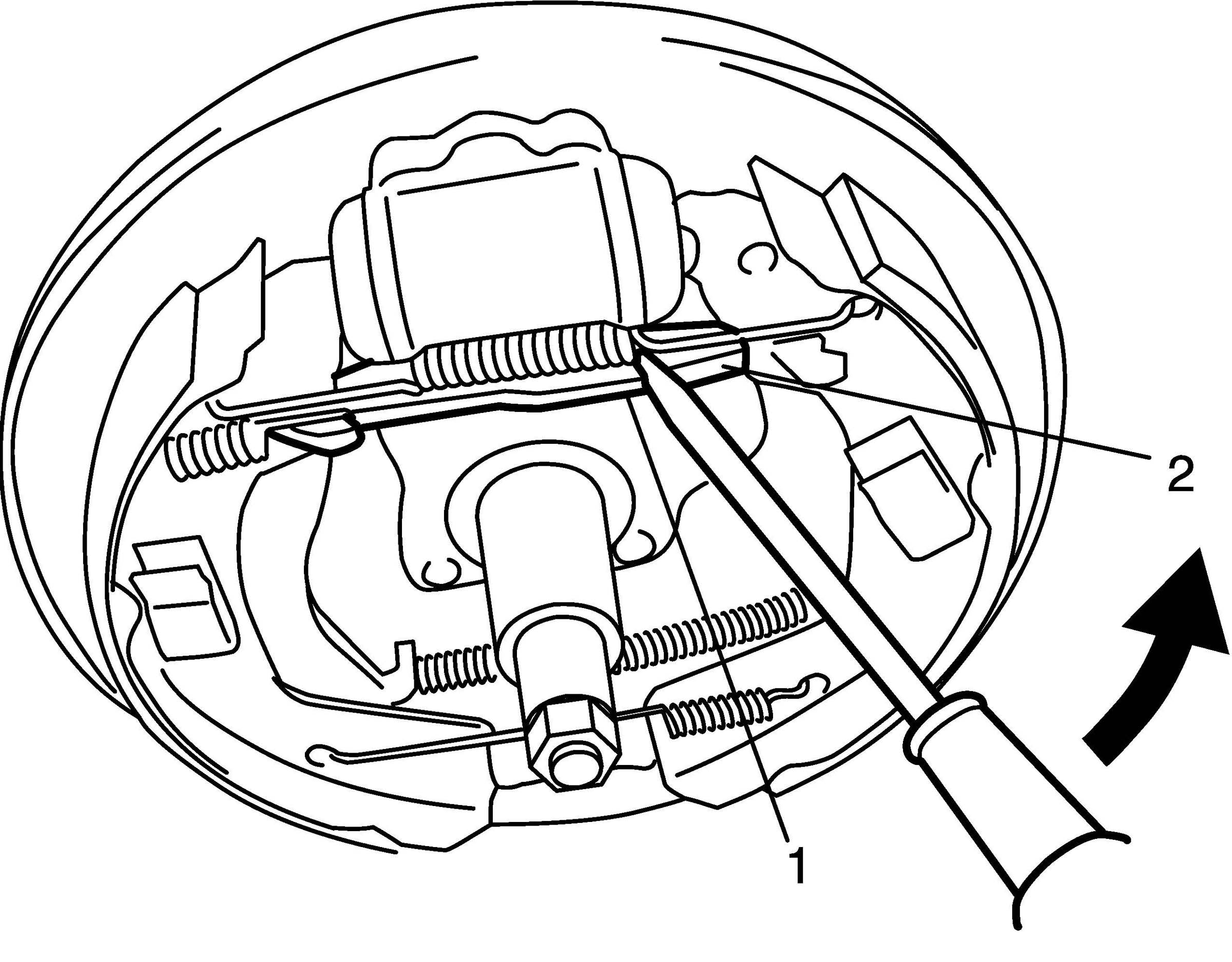 1. Before installing brake drum, to maximize brake shoe-to-drum clearance, put screwdriver between rod (1) and ratchet (2) and push down ratchet as shown in figure.