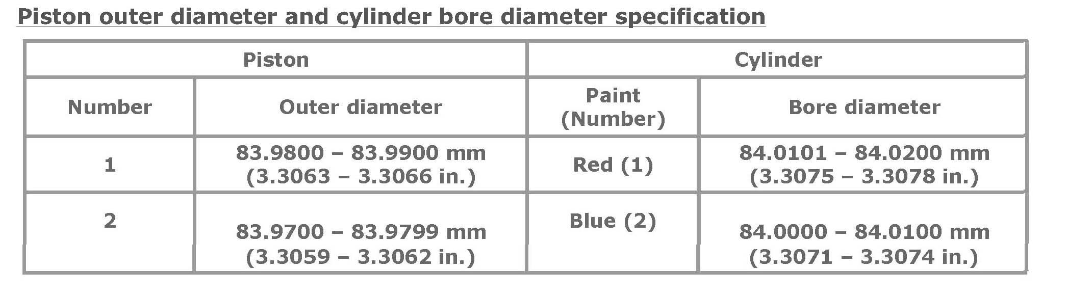 Standard 84.000 - 84.020 mm (3.3070 - 3.3078 in.)