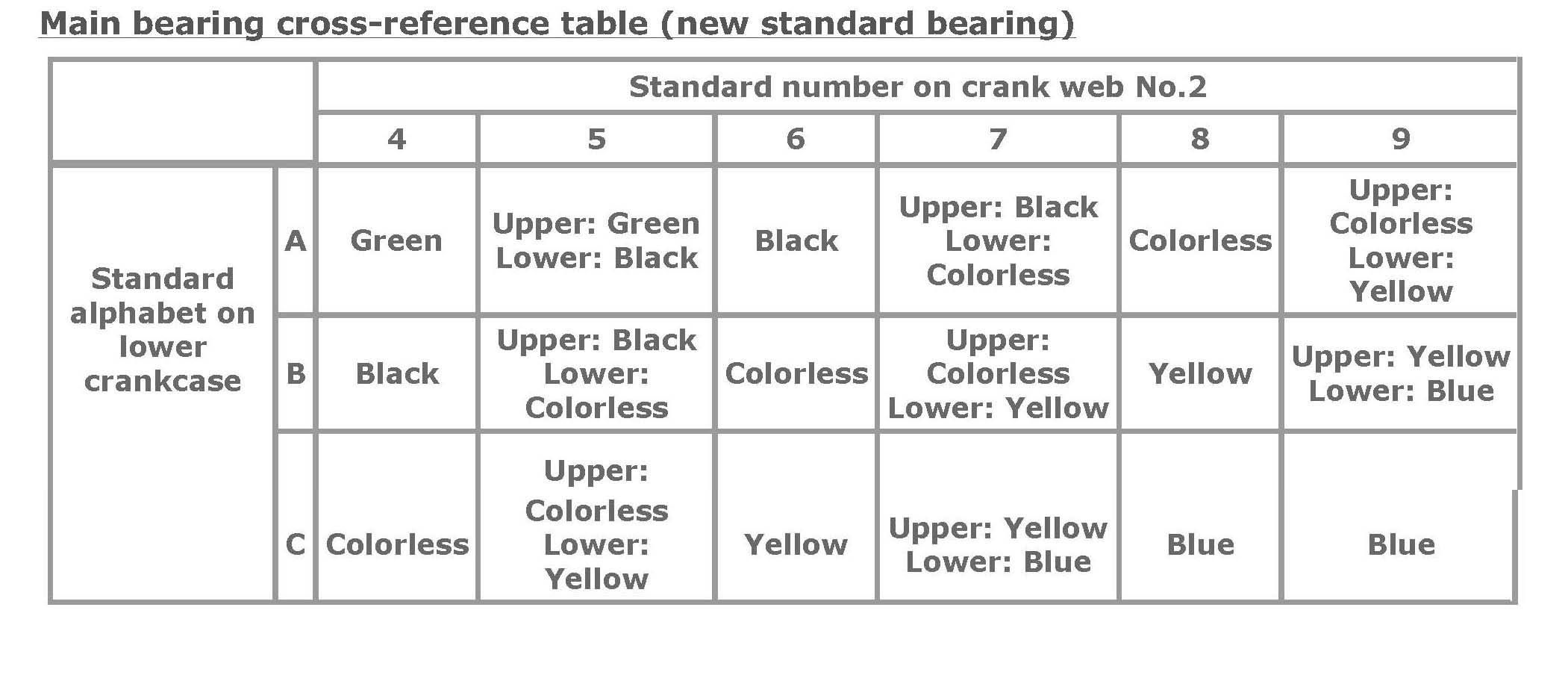 Main bearing cross-reference table (new standard bearing)