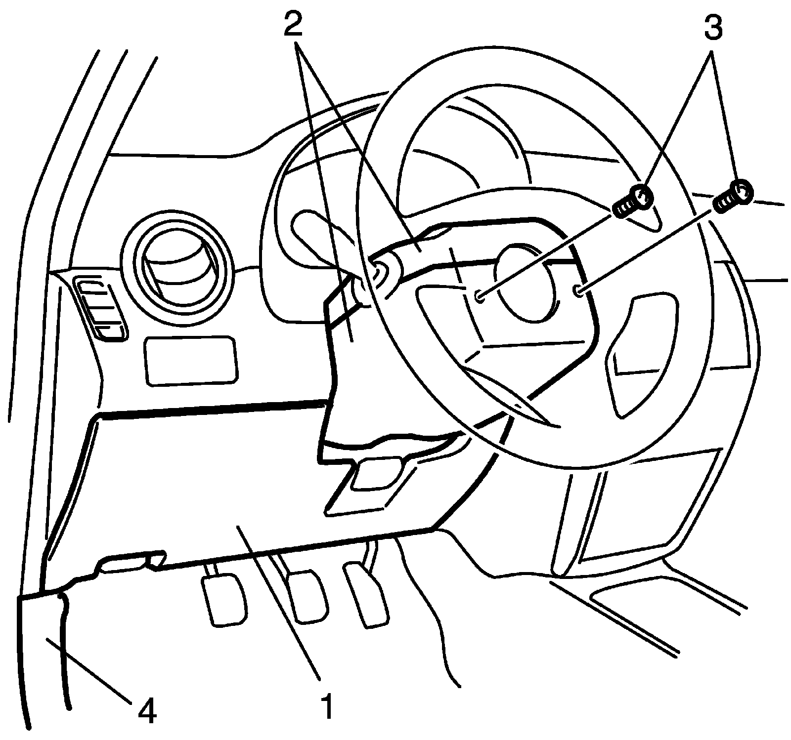 3. Remove dash side trim (4) and steering column hole cover (1).