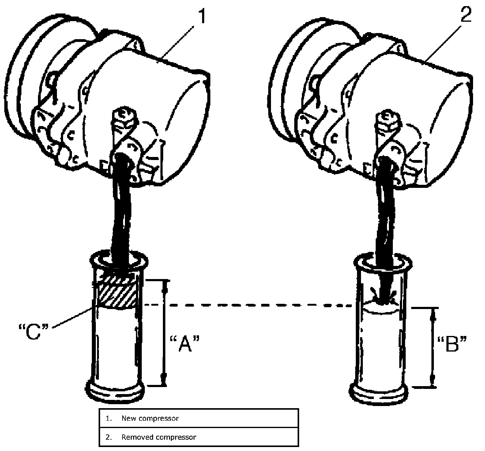 "B": Amount of oil in removed compressor