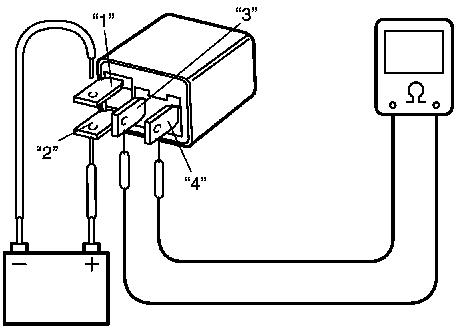 4. Check continuity between terminal "3" and "4". If there is no continuity when relay is connected to the battery, replace relay.