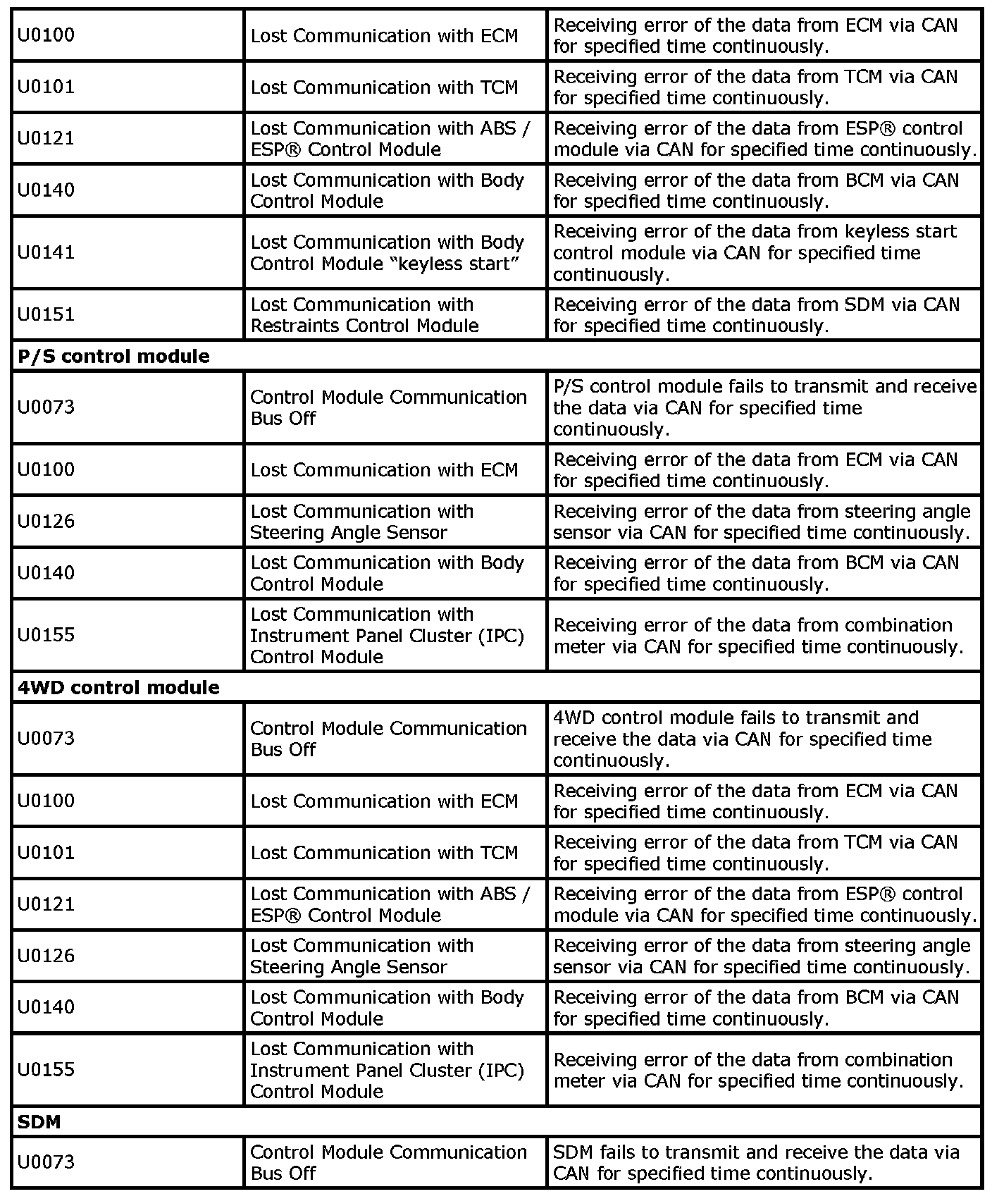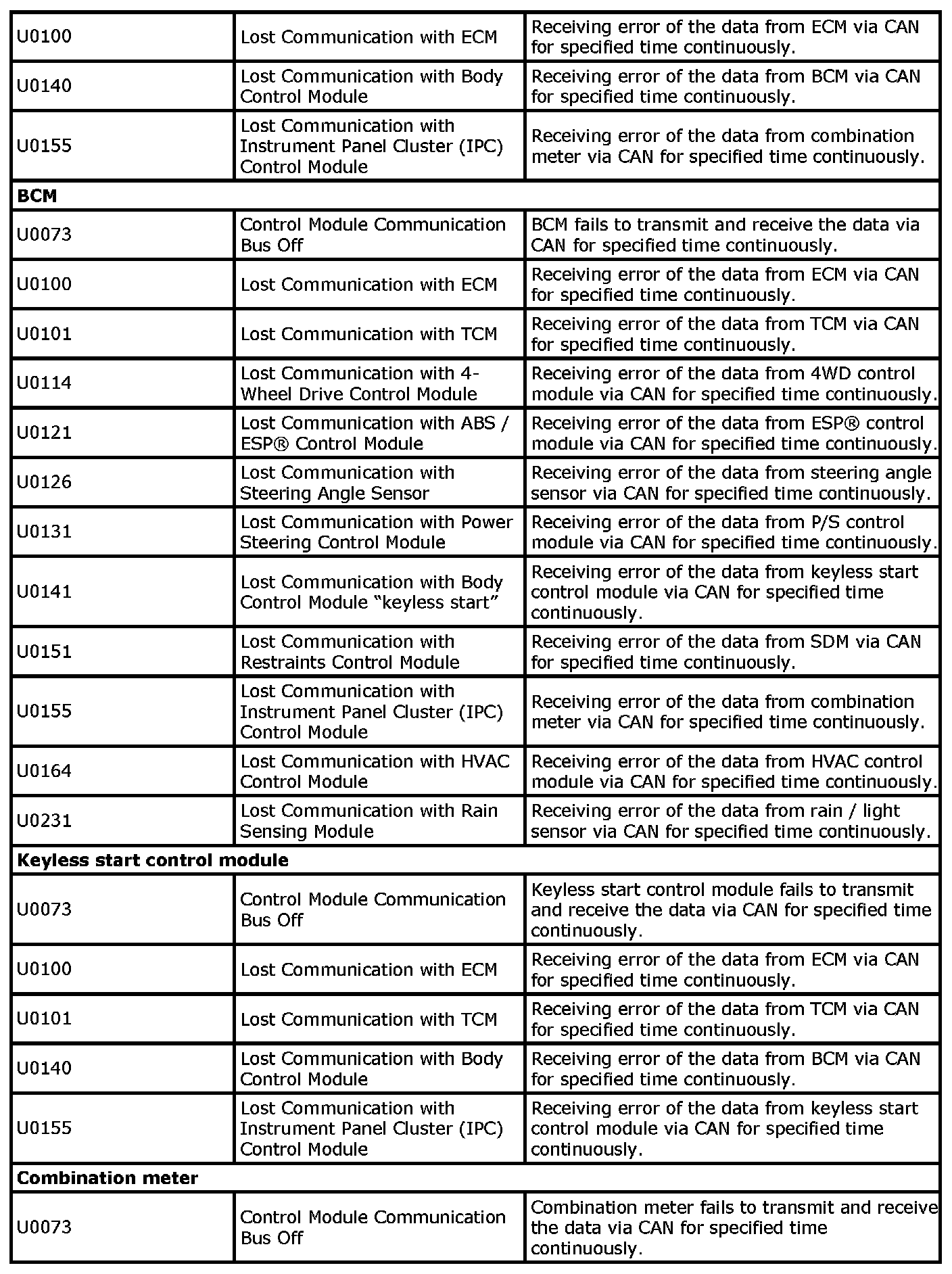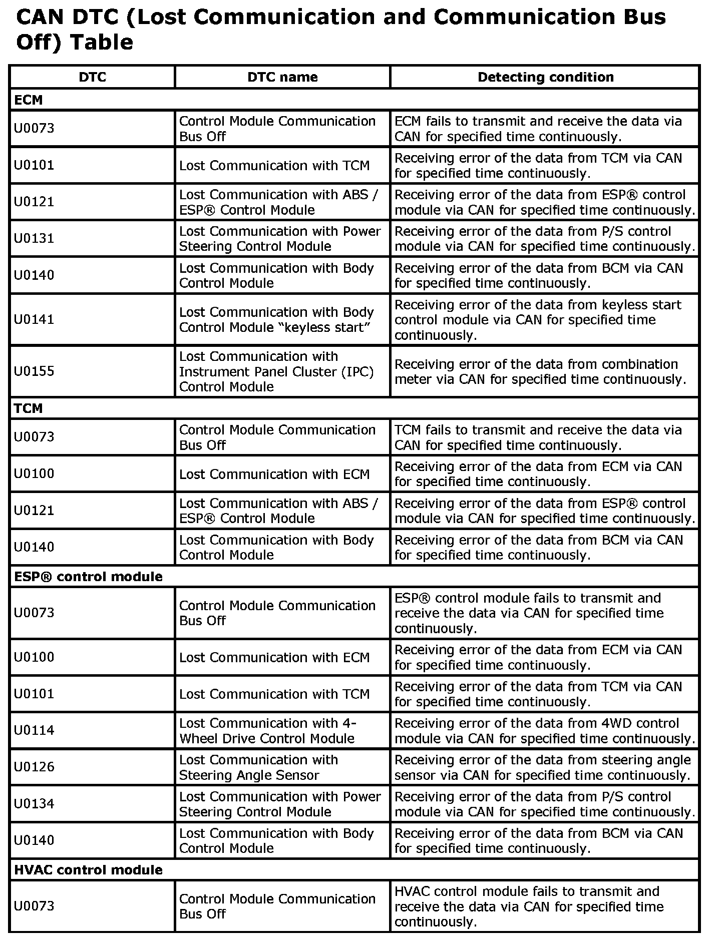 CAN DTC (Lost Communication and Communication Bus Off) Table